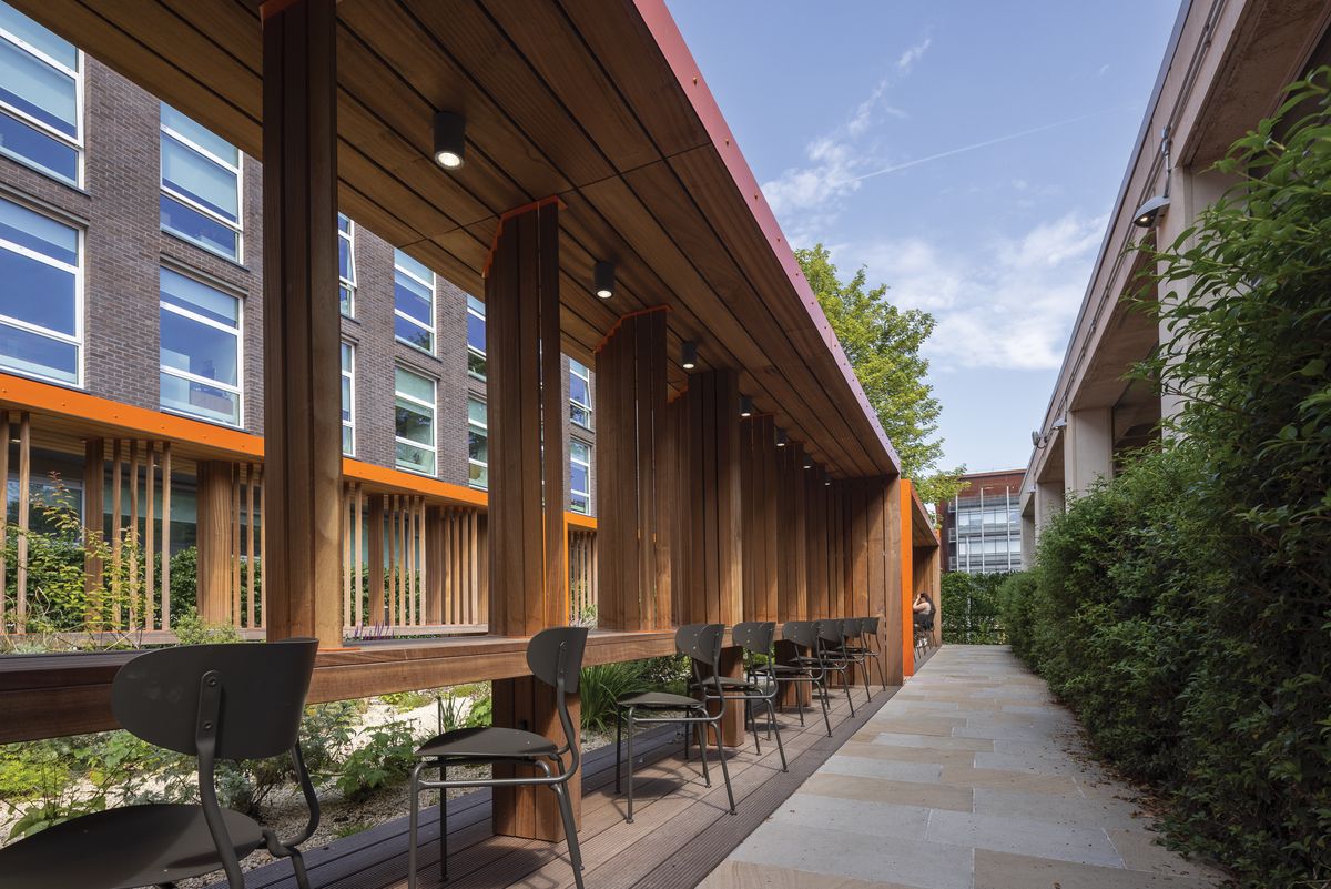 Стальная оцинкованная конструкция покрытая порошковой краской, сиденье и спинка стула из алюминиевого листа, как и столешница стола. Для интерьерной версии может быть использована фанера.