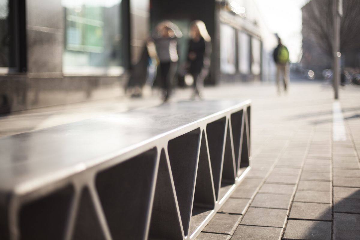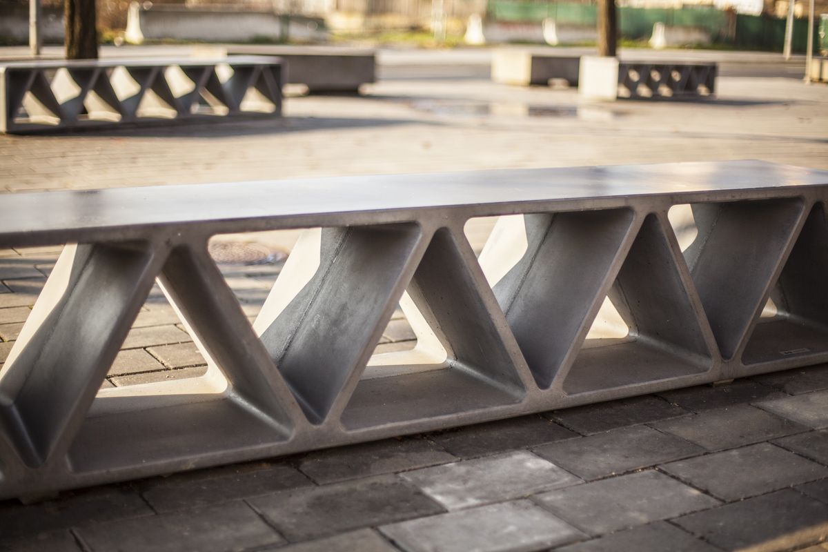 Форма этой скамьи, которую невозможно не заметить, вдохновлена одним из основных конструктивных элементов – фермы с треугольной решеткой. Скамья заимствует присущую ферме инженерную красоту и привносит ее в ландшафтную архитектуру. Размеренная игра четко определенных наклонных и прямоугольных плоскостей соединенных с радиусным сопряжением придает характер этому параллелепипеду из высококачественного UHPC бетона. Небольшие ножки на нижней стороне немного приподнимают массу скамейки над поверхностью, что подчеркивает элегантность скамья и позволяет скрыть неровности поверхности. Скамью длиной два с половиной метра можно установить как отдельно, так и парами, или же выстраивать длинными рядами.