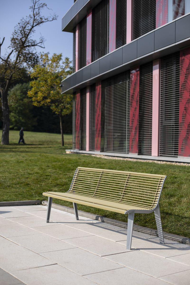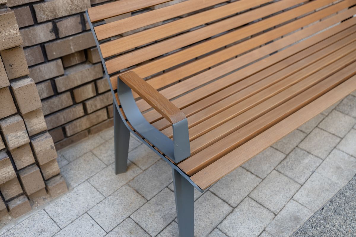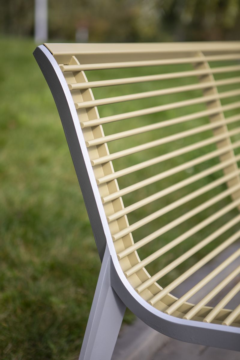 Опоры скамьи из переработанного и полностью перерабатываемого алюминиевого сплава, ламели из массива лиственницы, термоясеня или акации, подлокотники из горячеоцинкованной стали, покрытой порошковой краской или из нержавеющей стали. Сиденье и спинка предлагаются и в варианте из стальных стержней, возможен и вариант из нержавеющей стали. Доступна элегантная анкеровка в фундамент с помощью шпилек на химический анкер на предварительно подготовленное бетонное основание.
