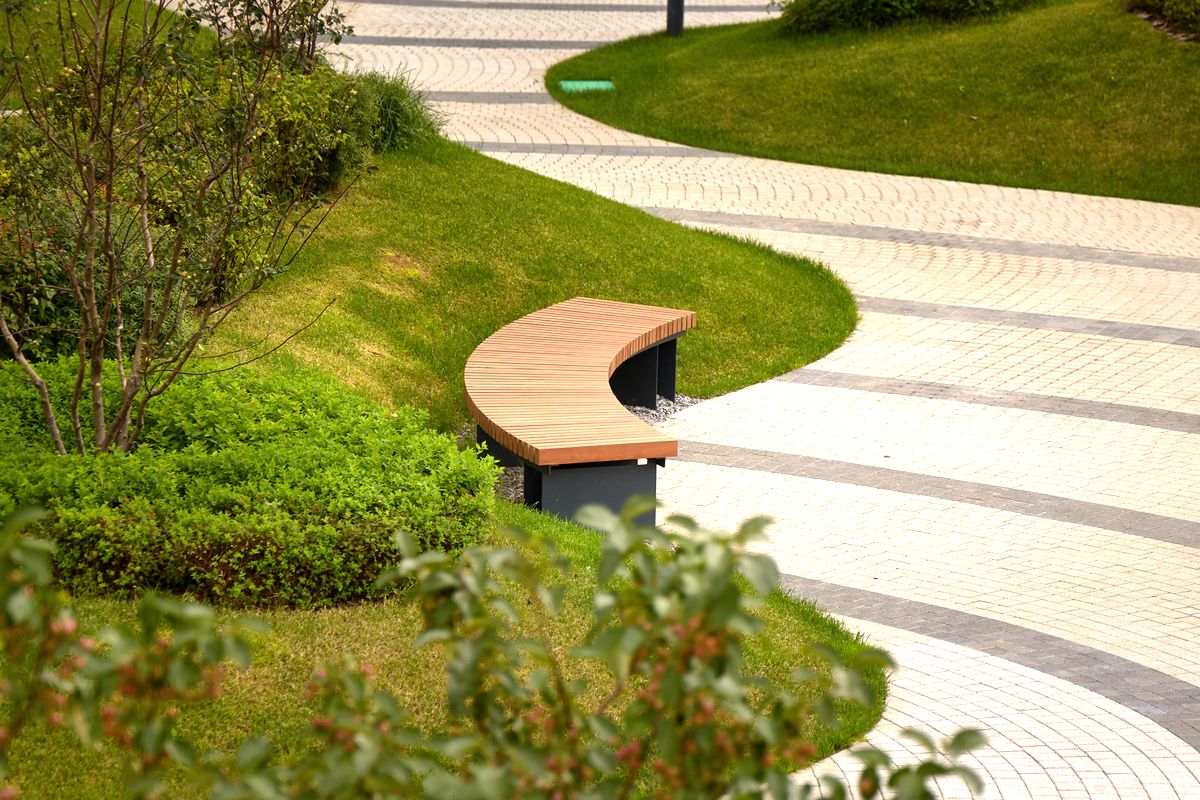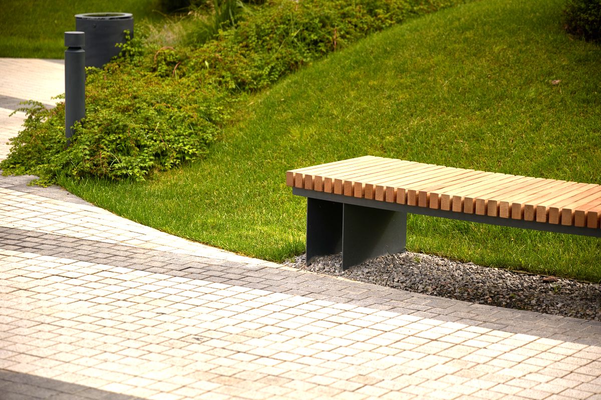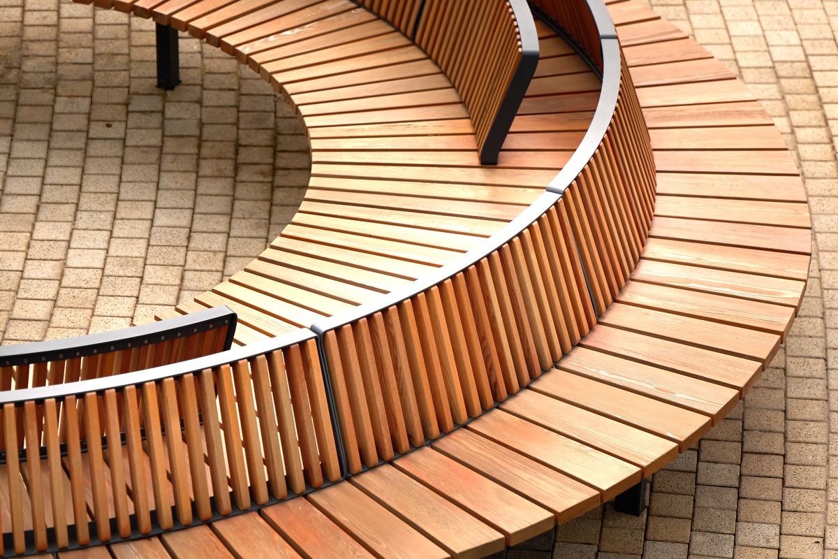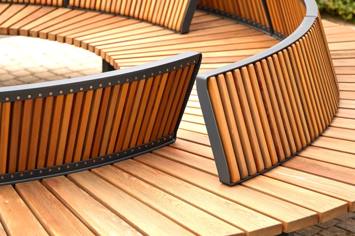Стальная, горячеоцинкованная конструкция, покрытая порошковой краской, поддерживает сиденья из лиственницы или термоясеня, с покрытием маслом. Крепление к поверхности производится на шпильки с помощью химических анкеров на предварительно подготовленное бетонное основание.