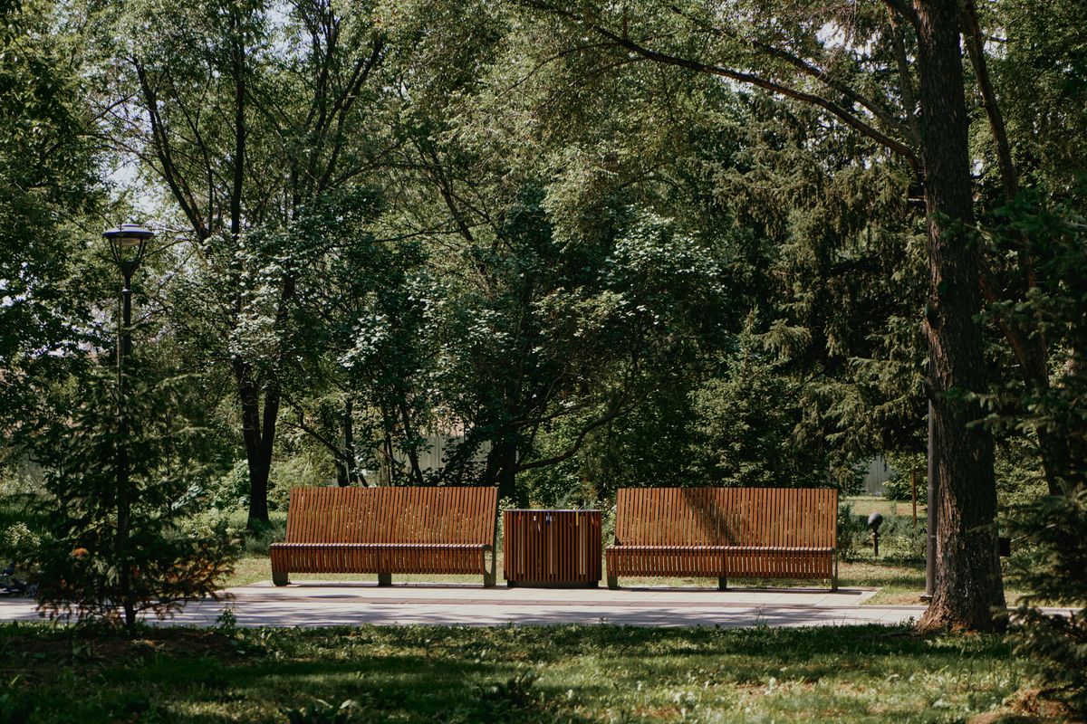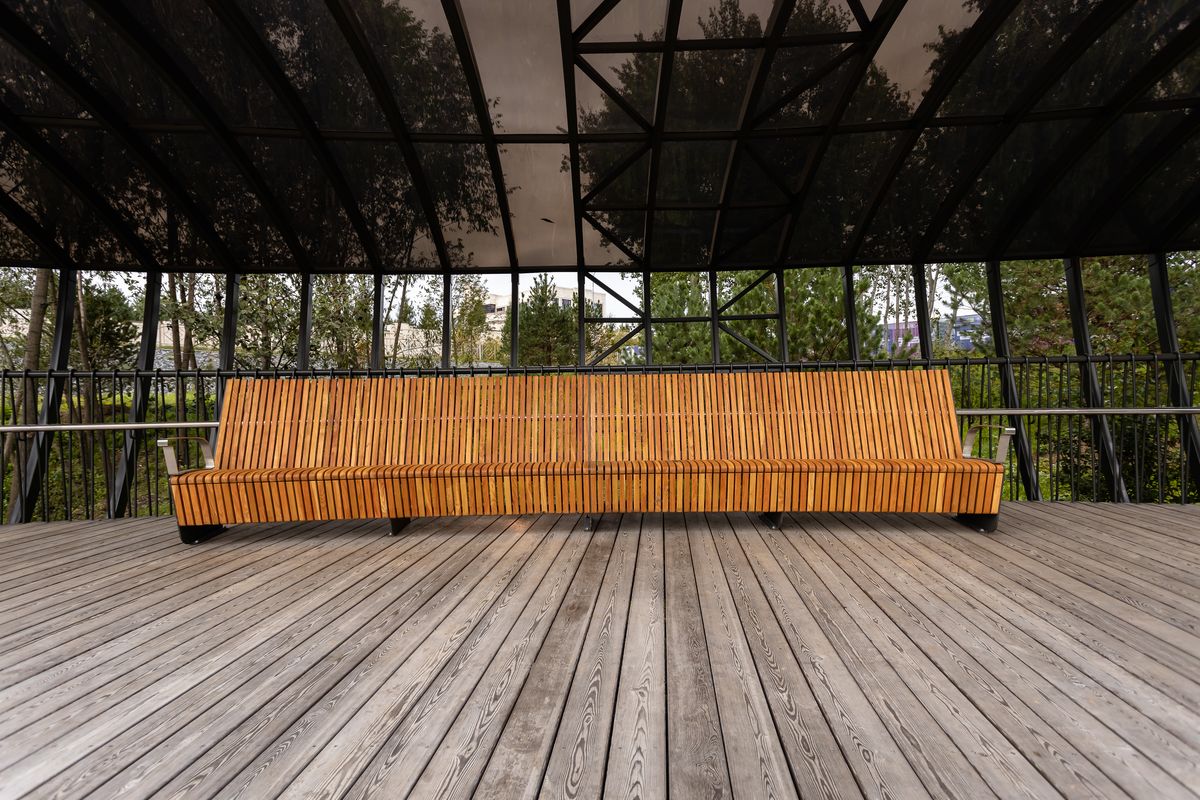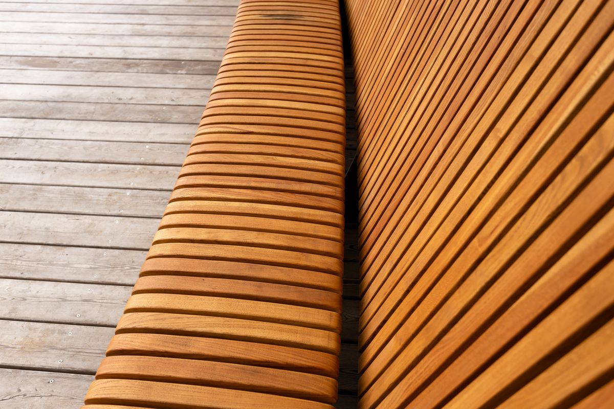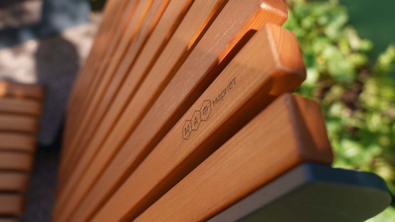 Стальная оцинкованная конструкция, покрытая порошковой краской. Сидение и спинка образованы поперечными ламелями из твердой древесины. Одиночные скамейки и сидения из нескольких модулей закрепляются на поверхности с помощью шпилек на химический анкер.
