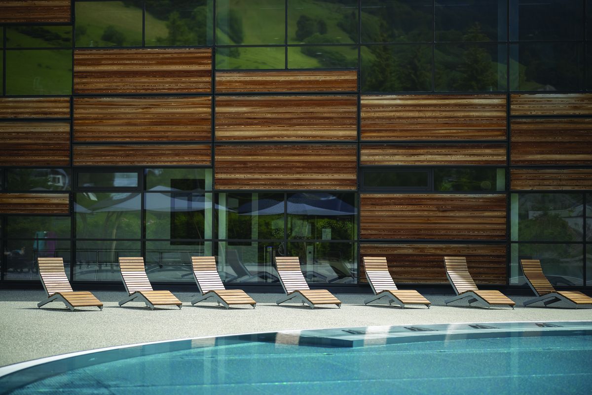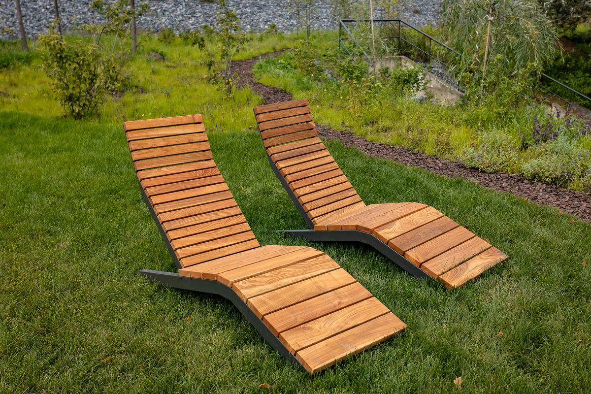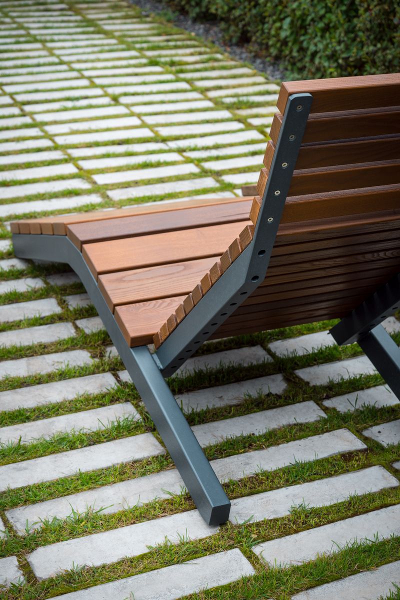 Оцинкованная стальная конструкция покрыта порошковой краской. Сиденье и спинка из деревянных ламелей, которые прочно и незаметно соединены с несущей конструкцией. Также доступен и цельнометаллический вариант с сиденьем из стальных стержней. Шезлонг можно изящным способом прикрепить к поверхности с помощью анкерных болтов или дополнить ножками из нержавеющей стали для свободного перемещения.