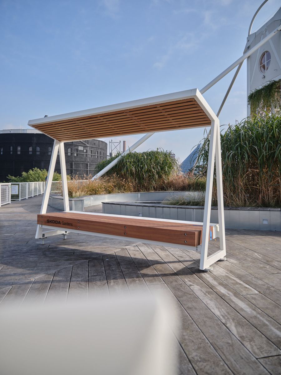 Сиденье из массивных деревянных досок, соединенных винтами из нержавеющей стали в несущий "сэндвич", стальная оцинкованная конструкция покрыта порошковой краской. Фотовольтаические панели общей номинальной мощностью 2 × 140Вт, расположенные над сиденьем с обшивкой из деревянных реек. Имеются 2 двойных встроенных USB-разъема для зарядки гаджетов. Опционально Wi-Fi роутер с зоной покрытия 100 м.