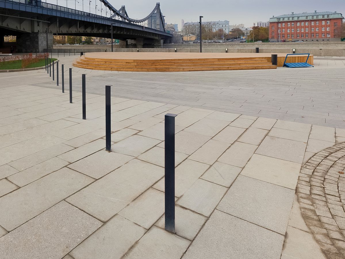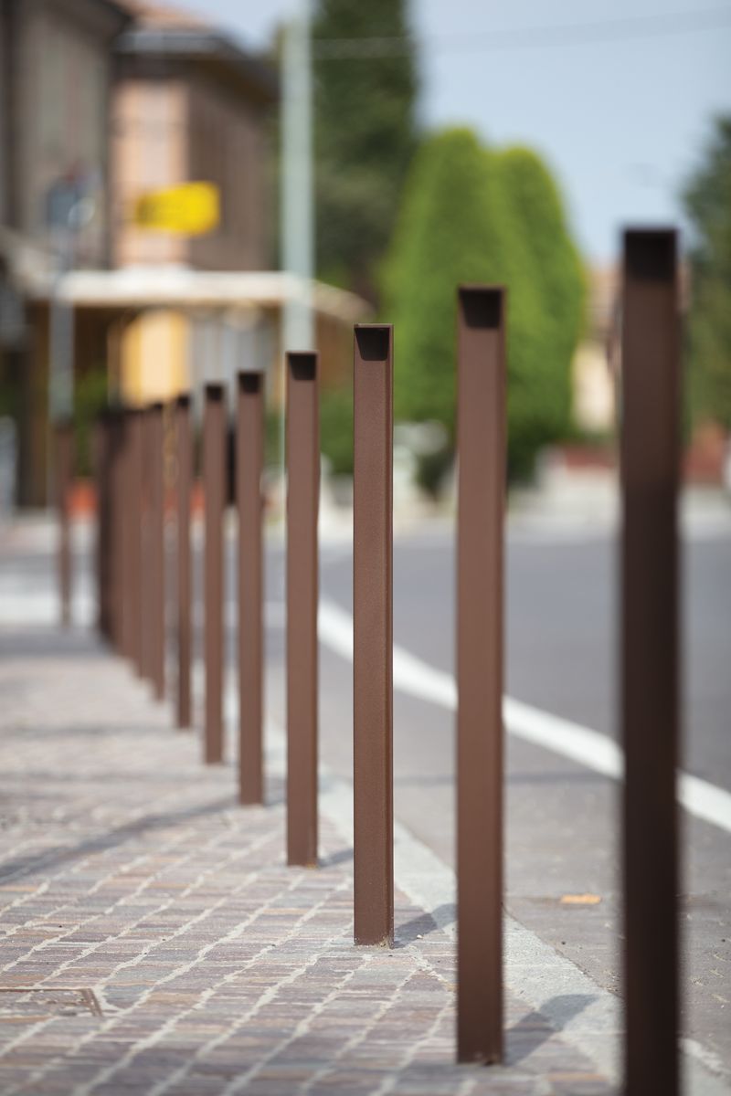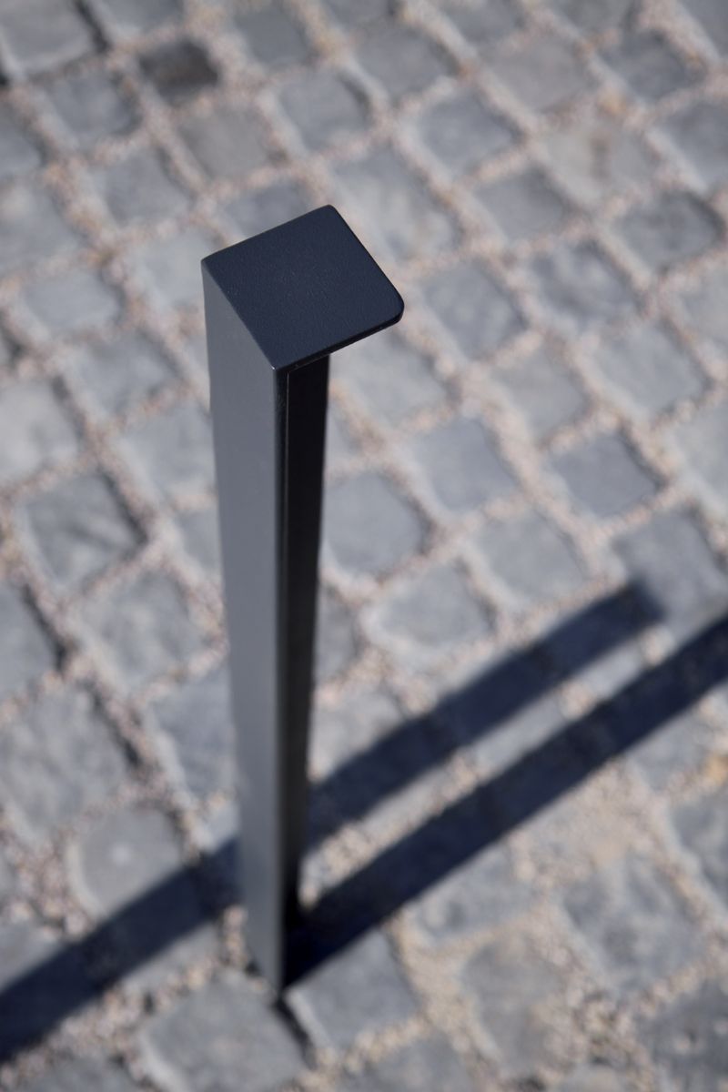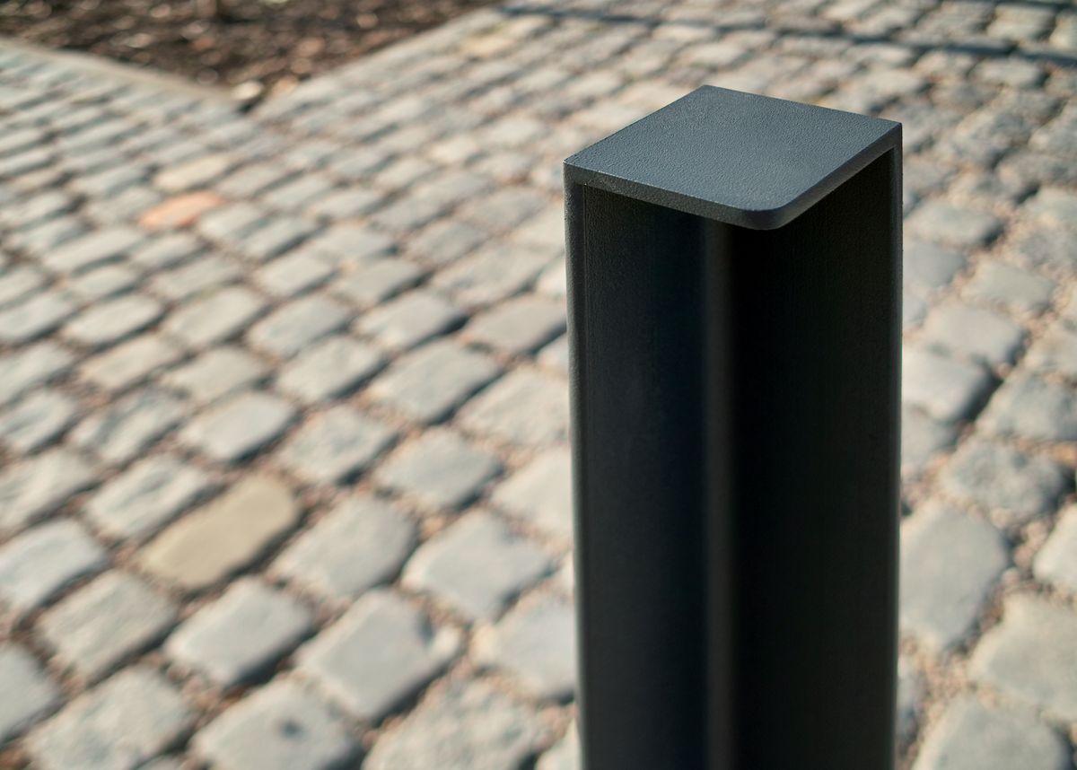 Стальная оцинкованная конструкция, покрытая порошковой краской. Возможность прикрепления соединительной цепочки. Крепление к поверхности производится на шпильки с помощью химических анкеров на предварительно подготовленное бетонное основание ниже уровня мощения. Также доступны съемные варианты.