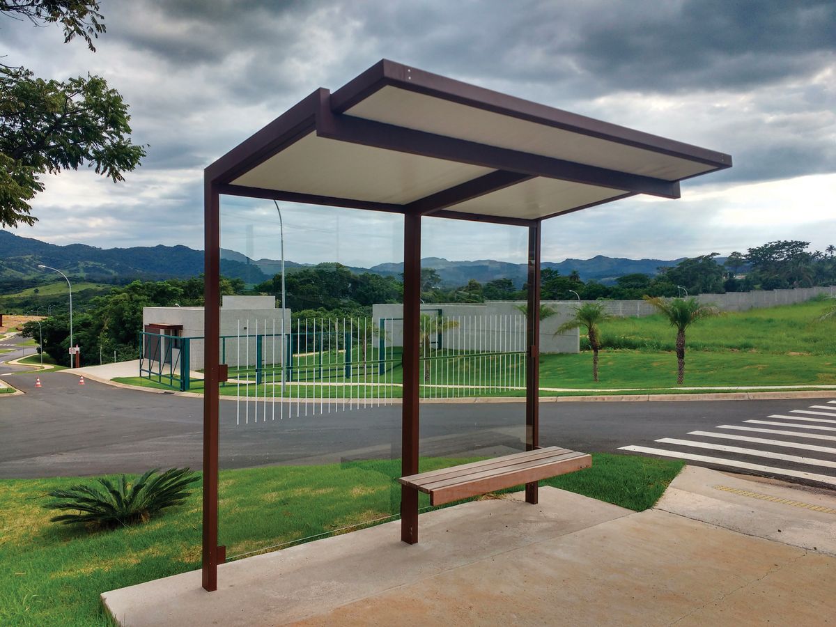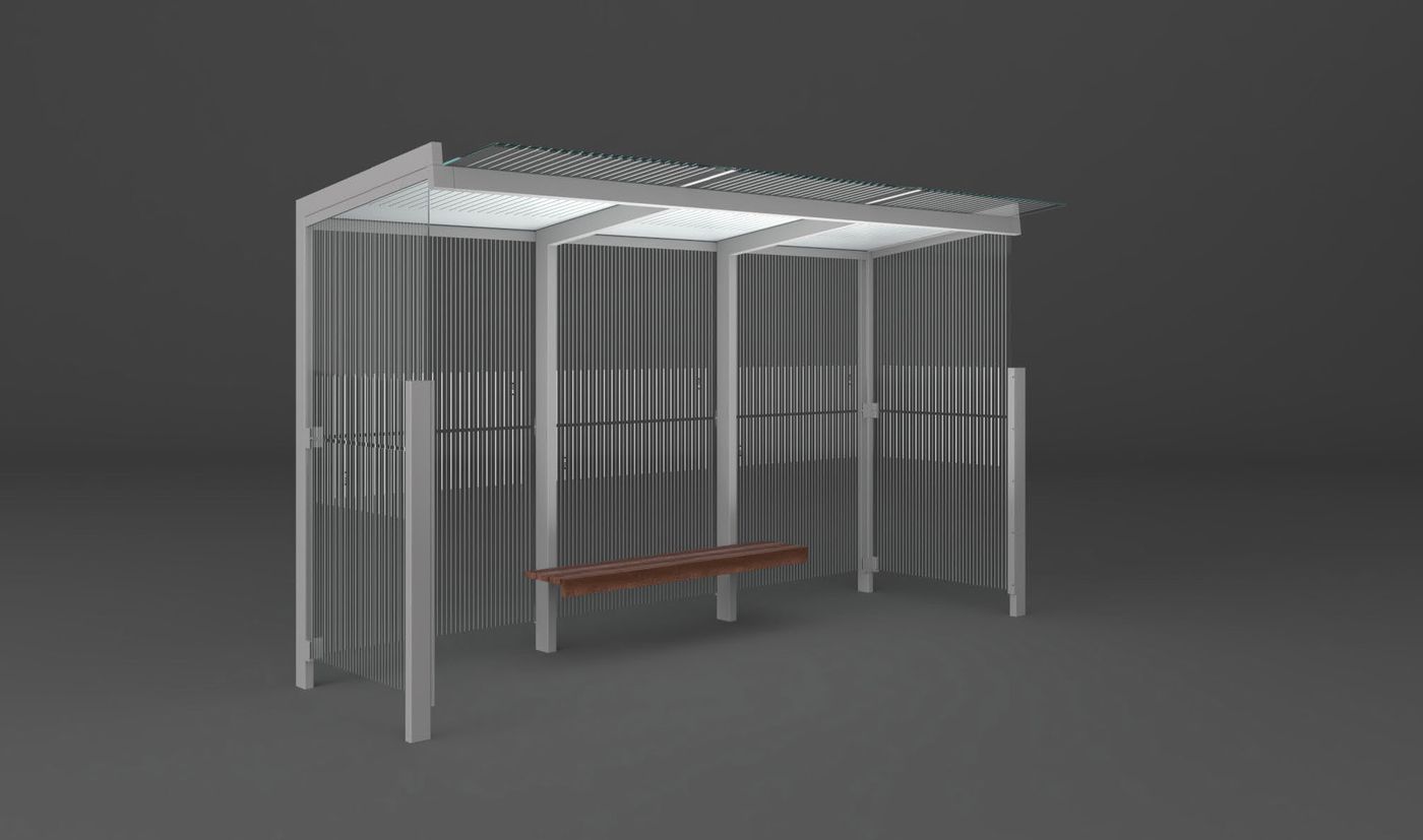 Конструкция из горячеоцинкованной стали покрывается порошковым покрытием. Задние и боковые стенки выполнены из закаленного стекла, деревянных планок или перфорированного металлического листа. Крыша из безопасного стекла, трапециевидного металлического листа или алюминиевой сэндвич-панели. Дренажная система встроена в одну из опор. Одна или две информационно-рекламные панели на боковых стенках.