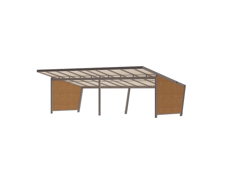 Конструкция из горячеоцинкованной стали, по желанию может быть покрыта порошковой краской. Укрытие может быть дополнено боковыми деревянными стенами, шкафом для электроустановок, возможно, подшивным деревянным потолком или осветительными приборами.
