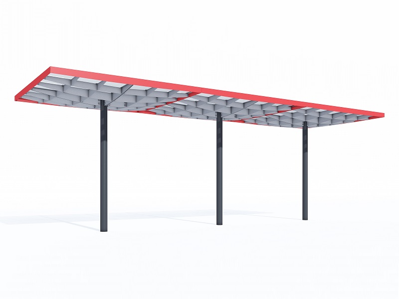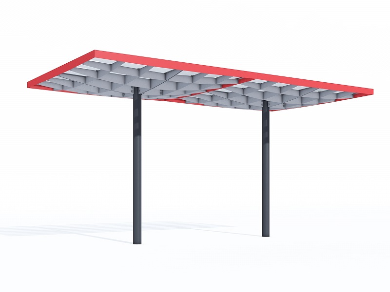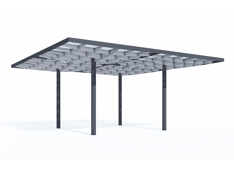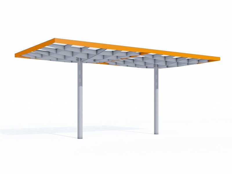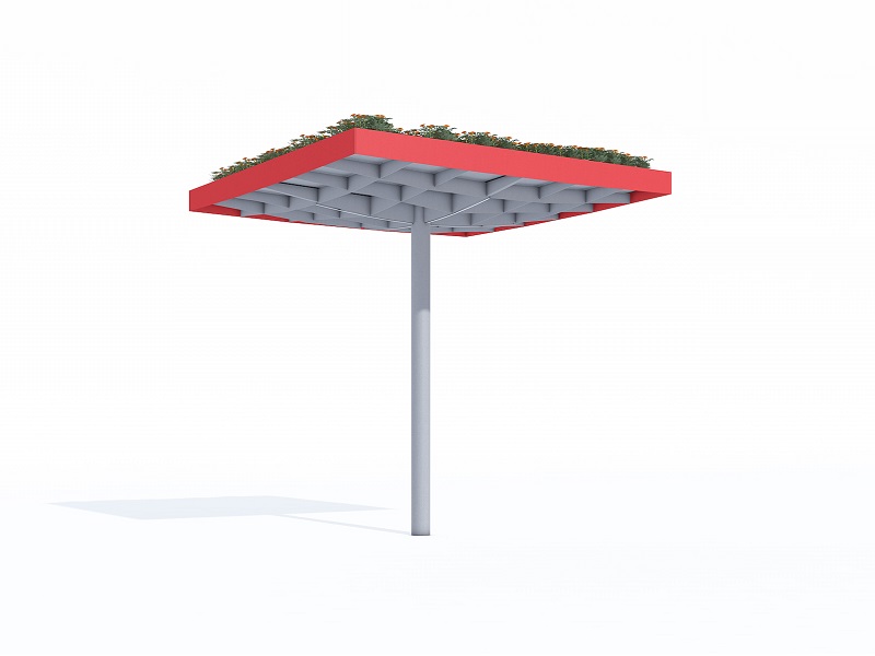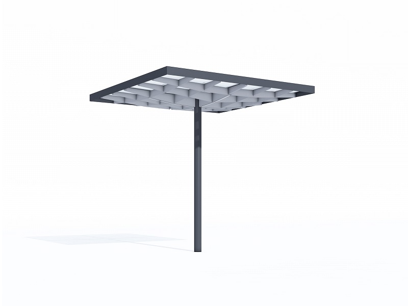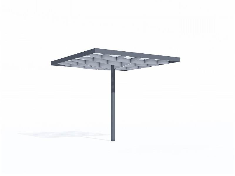 Конструкция из горячеоцинкованной стали, покрытая порошковой краской. Крыша из матового или цветного безопасного армированного стекла. Дренажная система встроена в опору. Светодиодная подсветка встраивается в поддерживающую квадратную сетку.