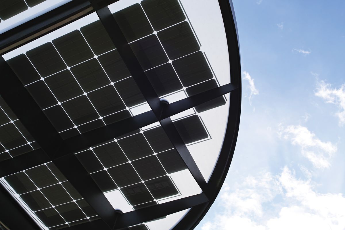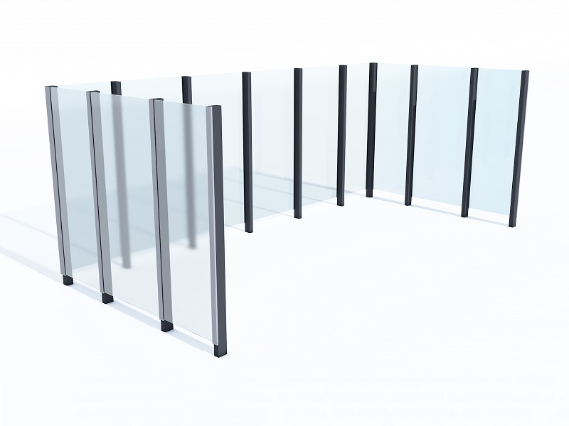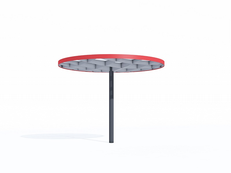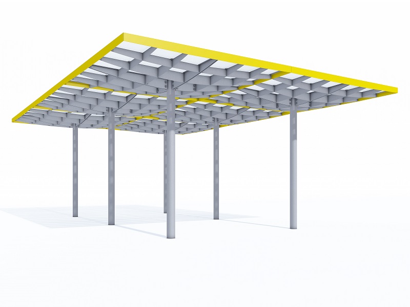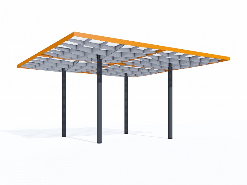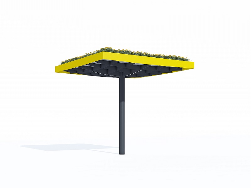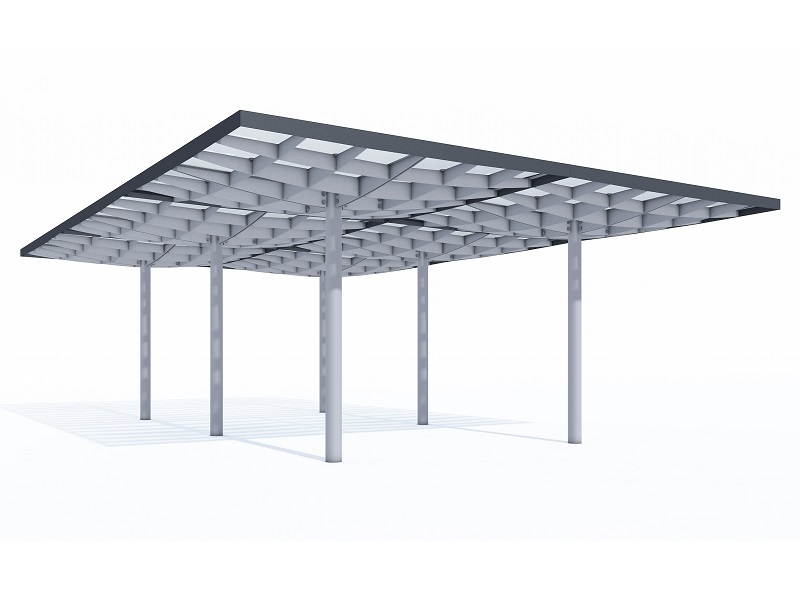 Конструкция из горячеоцинкованной стали, покрытая порошковой краской. Крыша из матового или цветного безопасного армированного стекла. Дренажная система встроена в опору. Светодиодная подсветка встраивается в поддерживающую квадратную сетку.