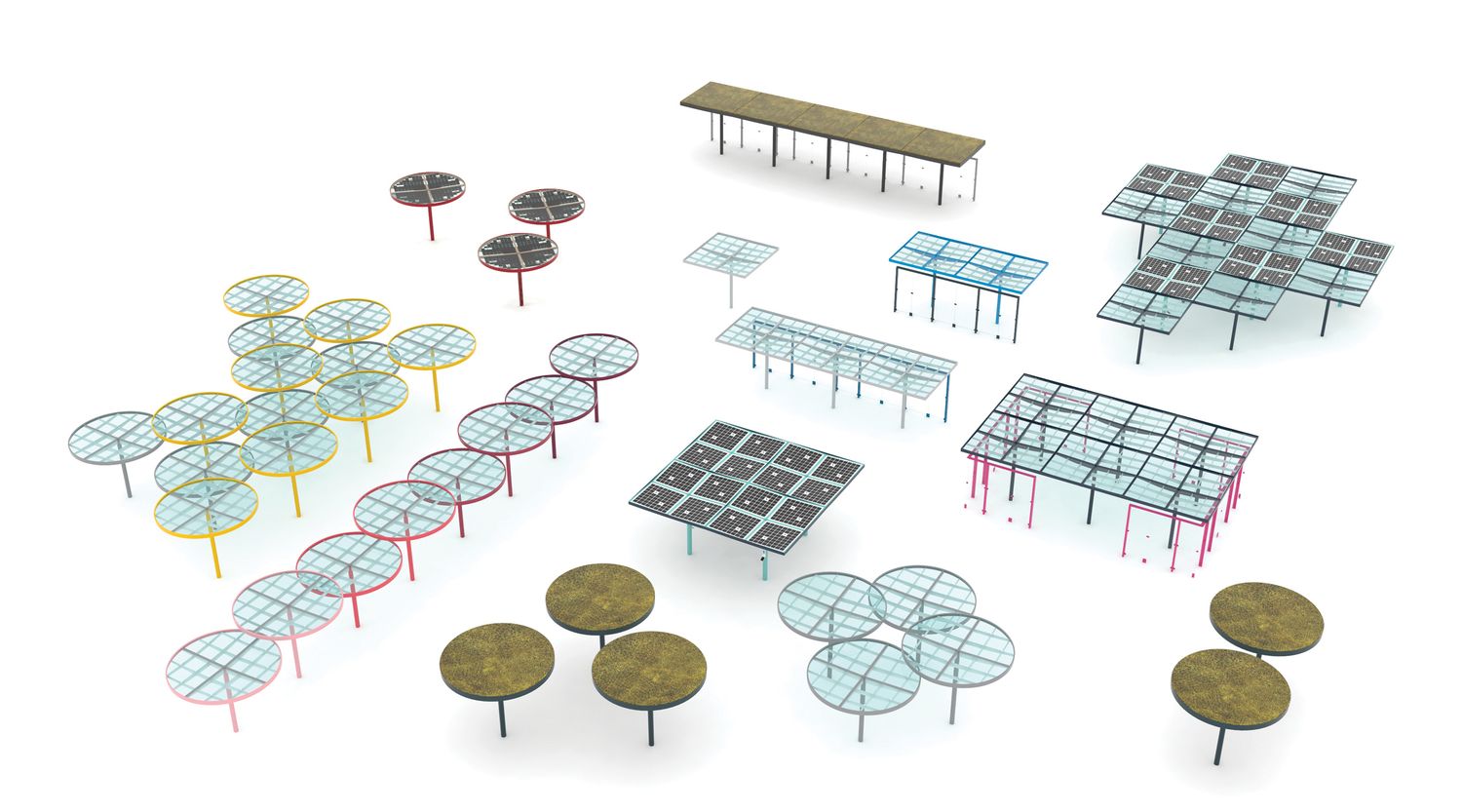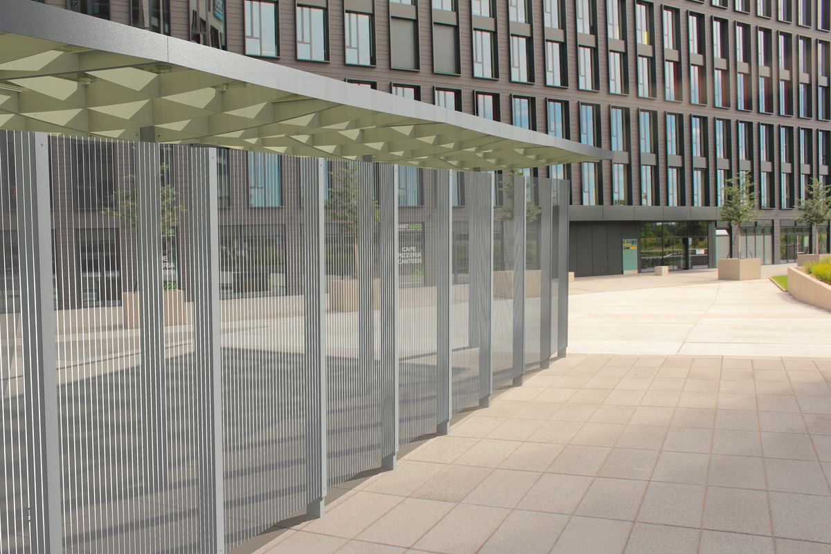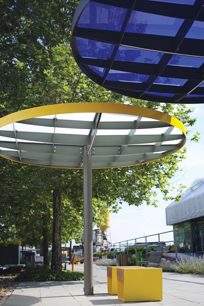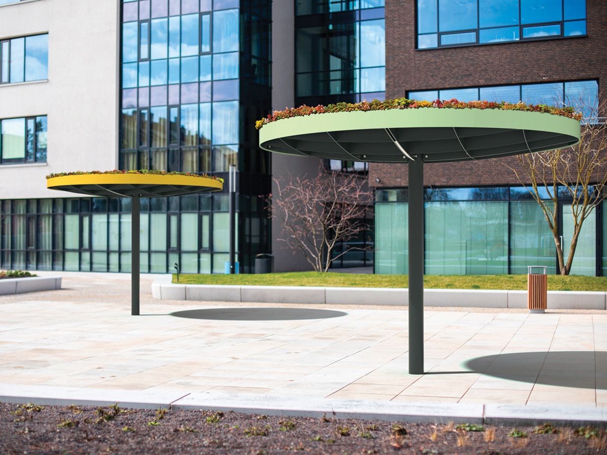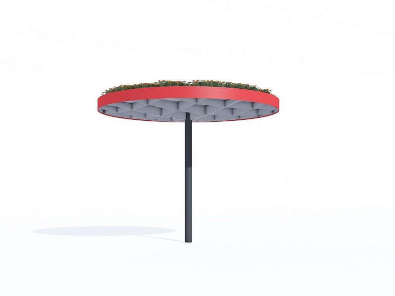 Модульная система, позволяющая собрать практически любое укрытие любых форм и размеров. Она была разработана в двух вариантах формы крыши. Квадратный модуль можно расположить один рядом с другим и расширить площадь крыши в четырех направлениях. Таким образом, получающиеся в результате сборки навесы могут быть квадратными, прямоугольными или любой неправильной формы, неограниченной ширины и длины. Круглый модуль, в свою очередь, может быть собран в группы, в которых отдельные модули накладываются друг на друга. Нельзя не отметить впечатление, получаемое от «леса» лаконичных опор. Характерная поддерживающая квадратная сетка балок создает элегантный потолок, который является одинаковым, как в квадратной, так и в круглой версии крыши. Pin отвечает эксплуатационным потребностям и пространственным ограничениям любого уличного пространства и позволяет создать в рамках одного проекта универсальную беседку, навес для автобуса или велосипеда, а также крытые переходы между зданиями. Светодиодное освещение, как и система отвода дождевой воды, полностью интегрировано в каждый модуль. В модельный ряд также входит универсальная система стеклянных ветровых ширм-экранов. Вместо крыши из закаленного и армированного стекла, возможно размещение слоя экстенсивной растительности – суккулентов.