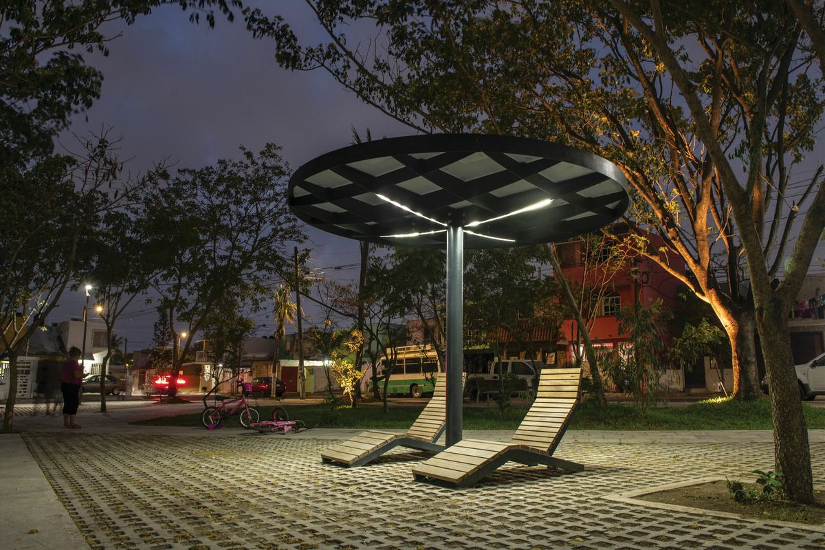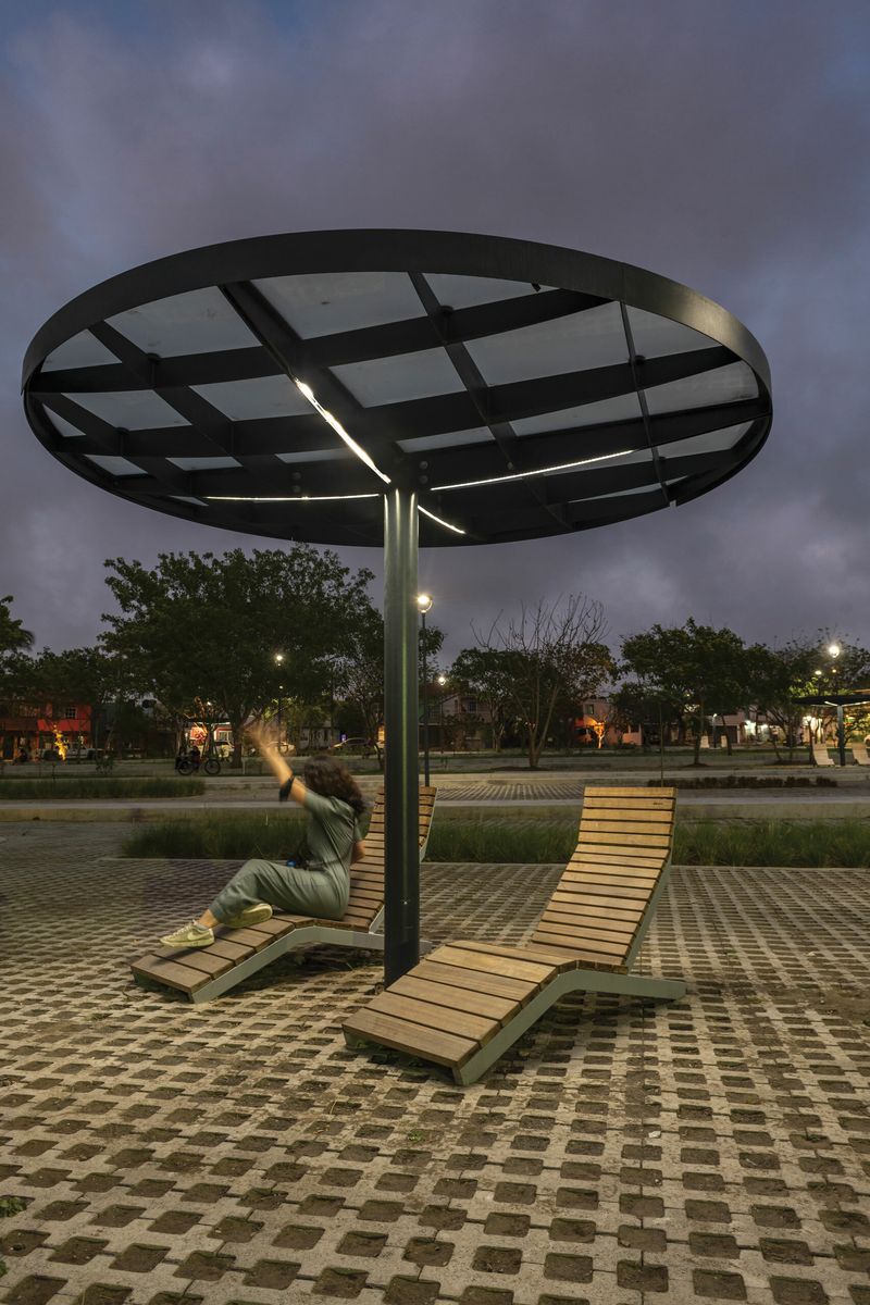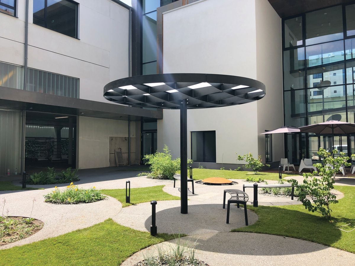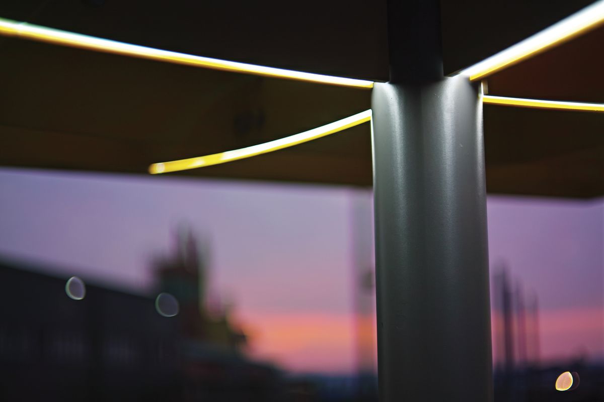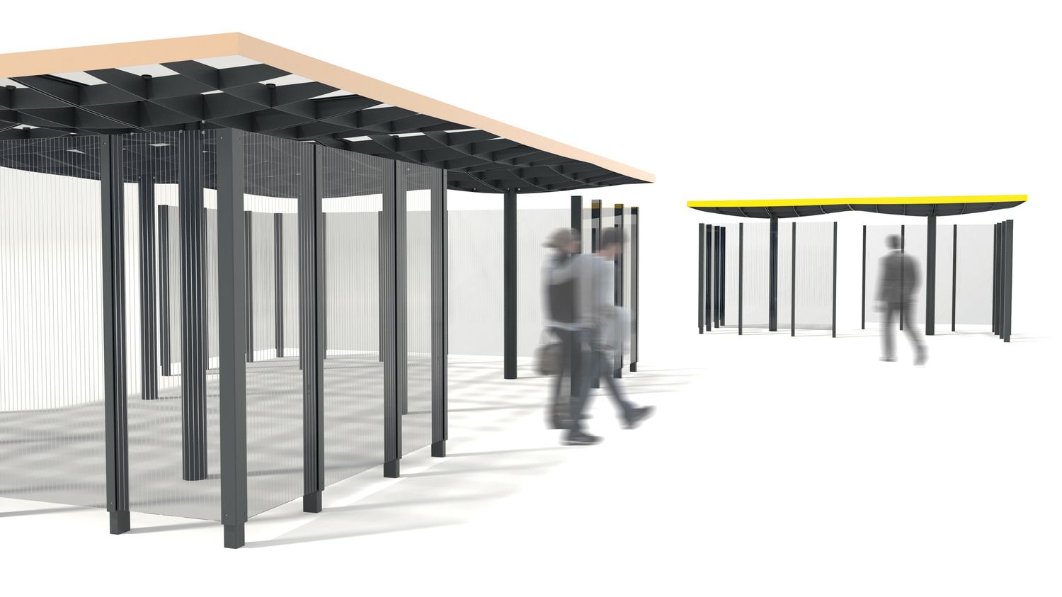 Модульная система, позволяющая собрать практически любое укрытие любых форм и размеров. Она была разработана в двух вариантах формы крыши. Квадратный модуль можно расположить один рядом с другим и расширить площадь крыши в четырех направлениях. Таким образом, получающиеся в результате сборки навесы могут быть квадратными, прямоугольными или любой неправильной формы, неограниченной ширины и длины. Круглый модуль, в свою очередь, может быть собран в группы, в которых отдельные модули накладываются друг на друга. Нельзя не отметить впечатление, получаемое от «леса» лаконичных опор. Характерная поддерживающая квадратная сетка балок создает элегантный потолок, который является одинаковым, как в квадратной, так и в круглой версии крыши. Pin отвечает эксплуатационным потребностям и пространственным ограничениям любого уличного пространства и позволяет создать в рамках одного проекта универсальную беседку, навес для автобуса или велосипеда, а также крытые переходы между зданиями. Светодиодное освещение, как и система отвода дождевой воды, полностью интегрировано в каждый модуль. В модельный ряд также входит универсальная система стеклянных ветровых ширм-экранов. Вместо крыши из закаленного и армированного стекла, возможно размещение слоя экстенсивной растительности – суккулентов.