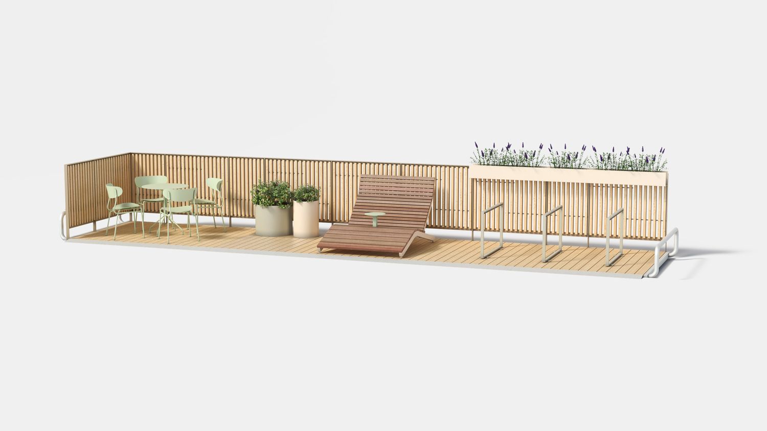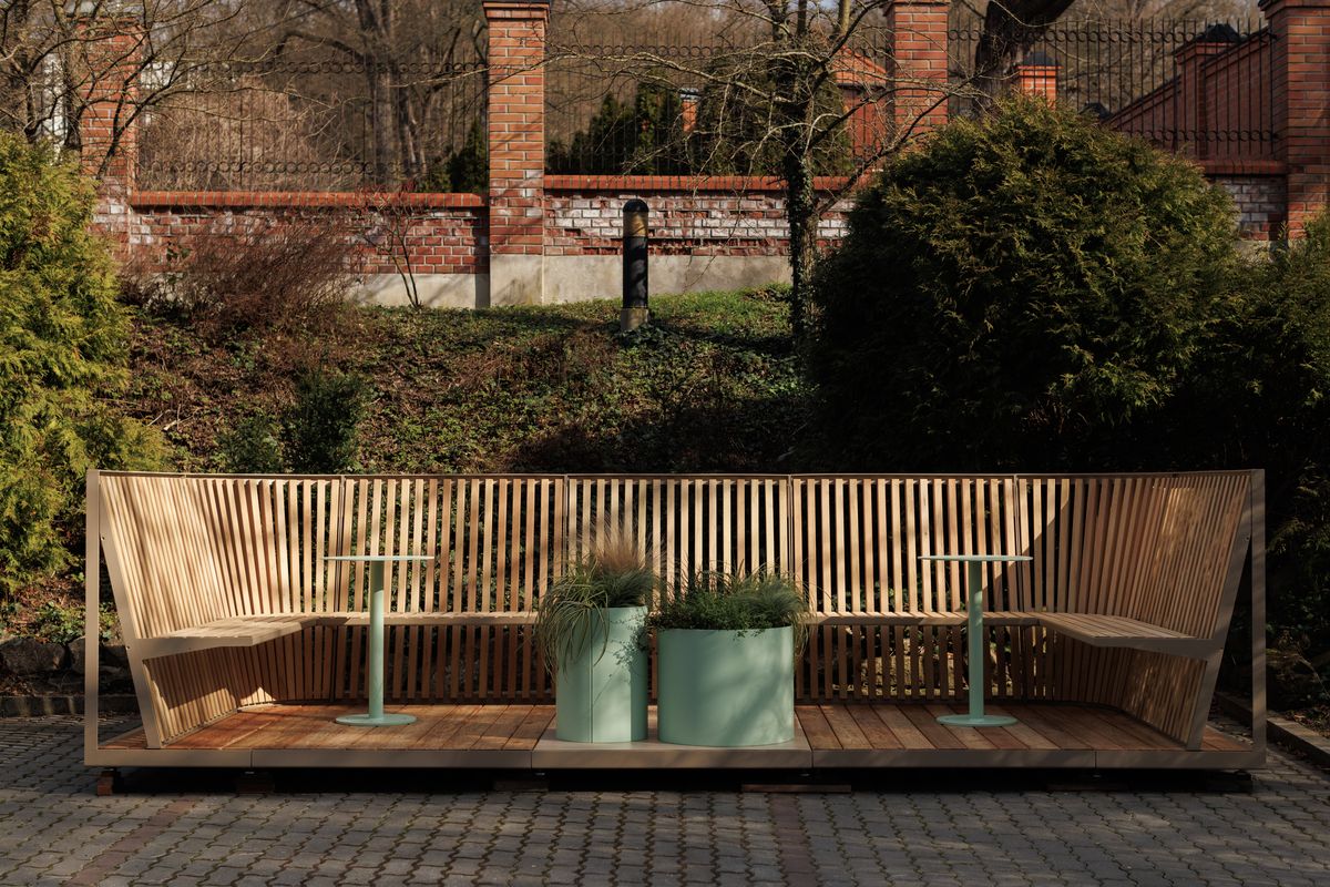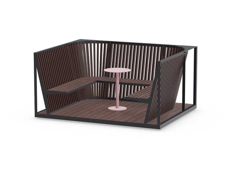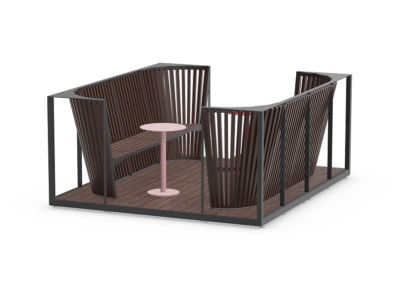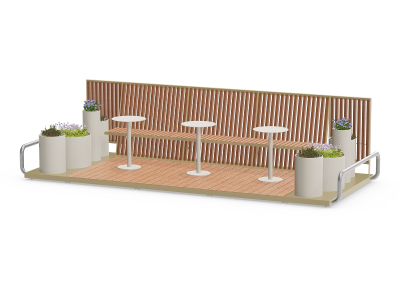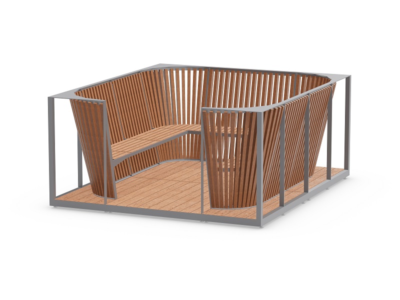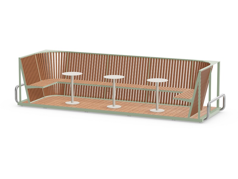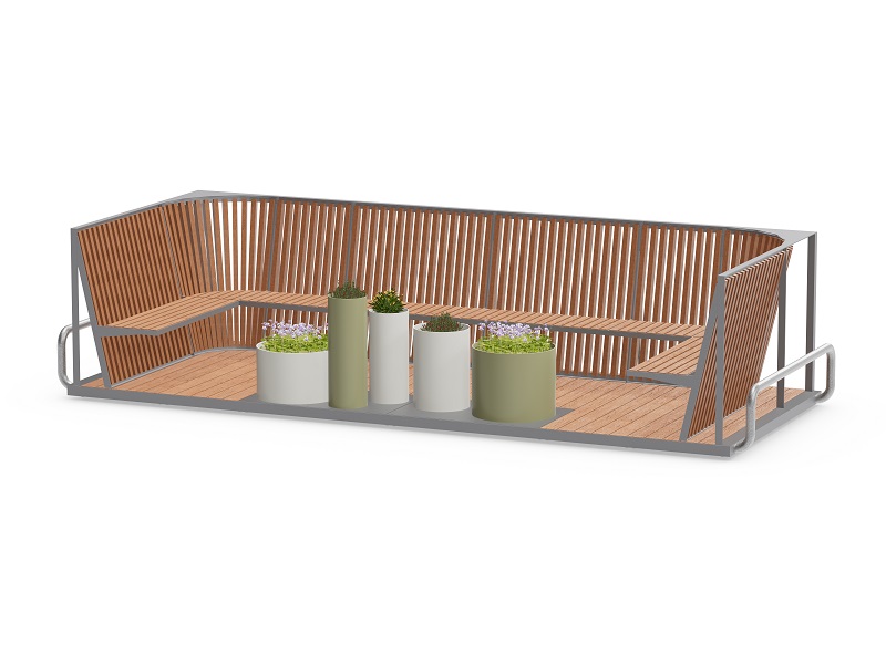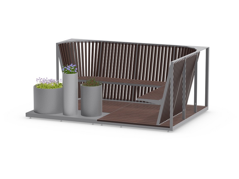 Модульная система изготавливается в двух вариантах глубины и ширины. Такое сочетание позволяет создавать различные варианты платформы, которые адаптируются к окружающей среде. Для ощущения безопасности она дополнена защитными зонами. Подпружиненные бортики безопасности помогают обеспечить комфорт в оживленном общественном пространстве. Конструкция из горячеоцинкованной стали с порошковым покрытием. Оцинкованный бампер с пружинами служит защитной зоной. Деревянные полы и боковые стенки дополнены деревянными рейками.