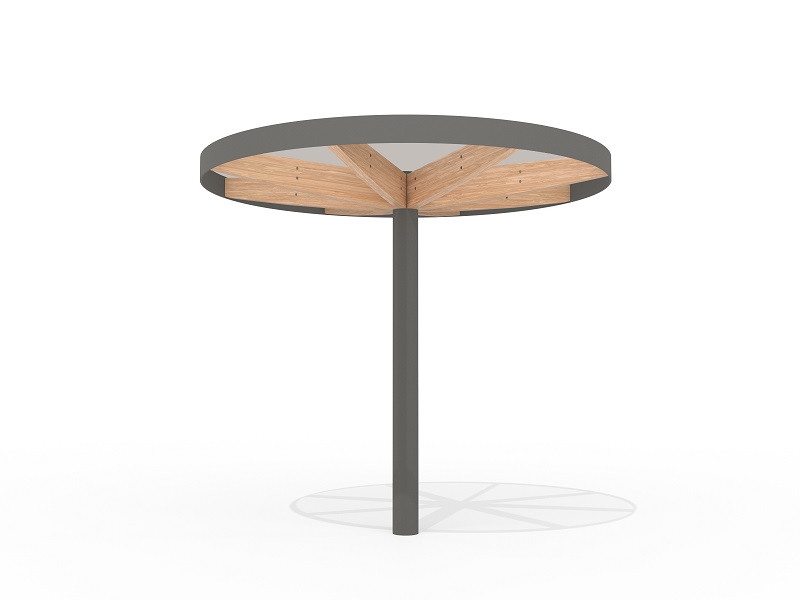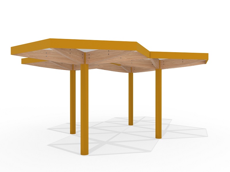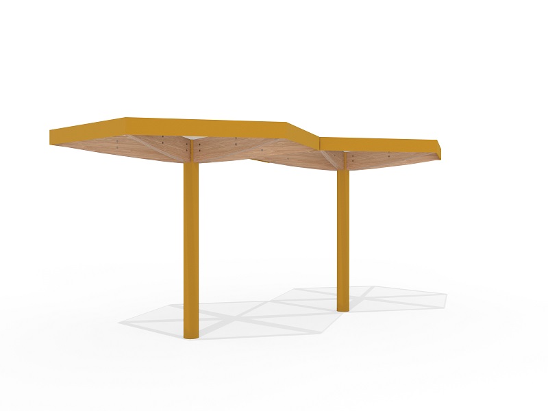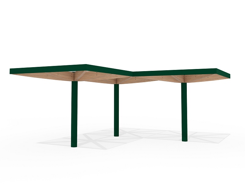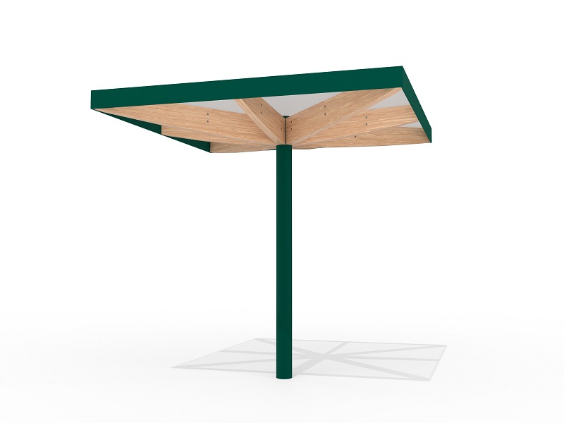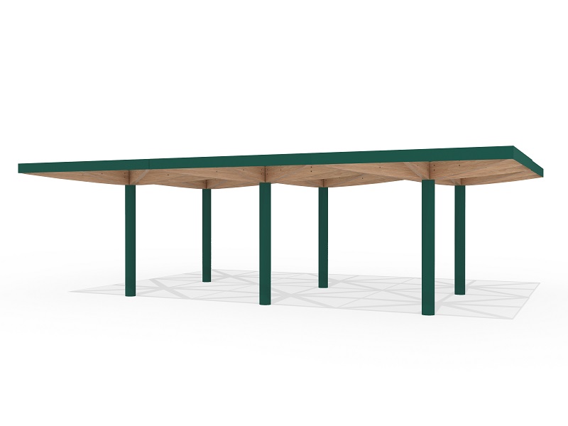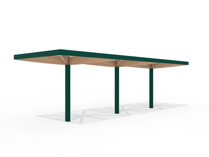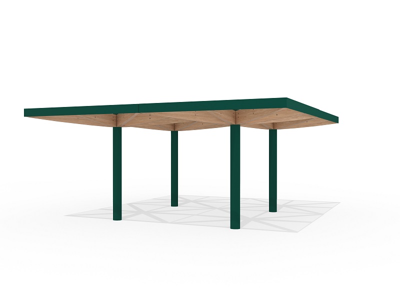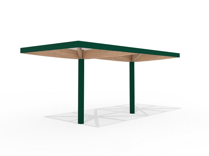 Легкость и воздушность конструкции подчеркивают шесть деревянных элементов, поддерживающих кровлю — они не только добавляют природное тепло, но и могут быть оснащены мягкой светодиодной подсветкой, создающей уютное освещение в вечернее время. Опора из прочной оцинкованной стали с порошковым покрытием скрывает в себе дренажную систему, а сама кровля предлагает два варианта исполнения: прозрачное безопасное стекло, пропускающее солнечный свет, или «зеленая» крыша с экстенсивным озеленением, гармонично вписывающая навес в природное окружение.
