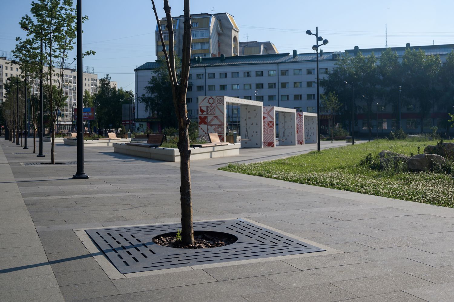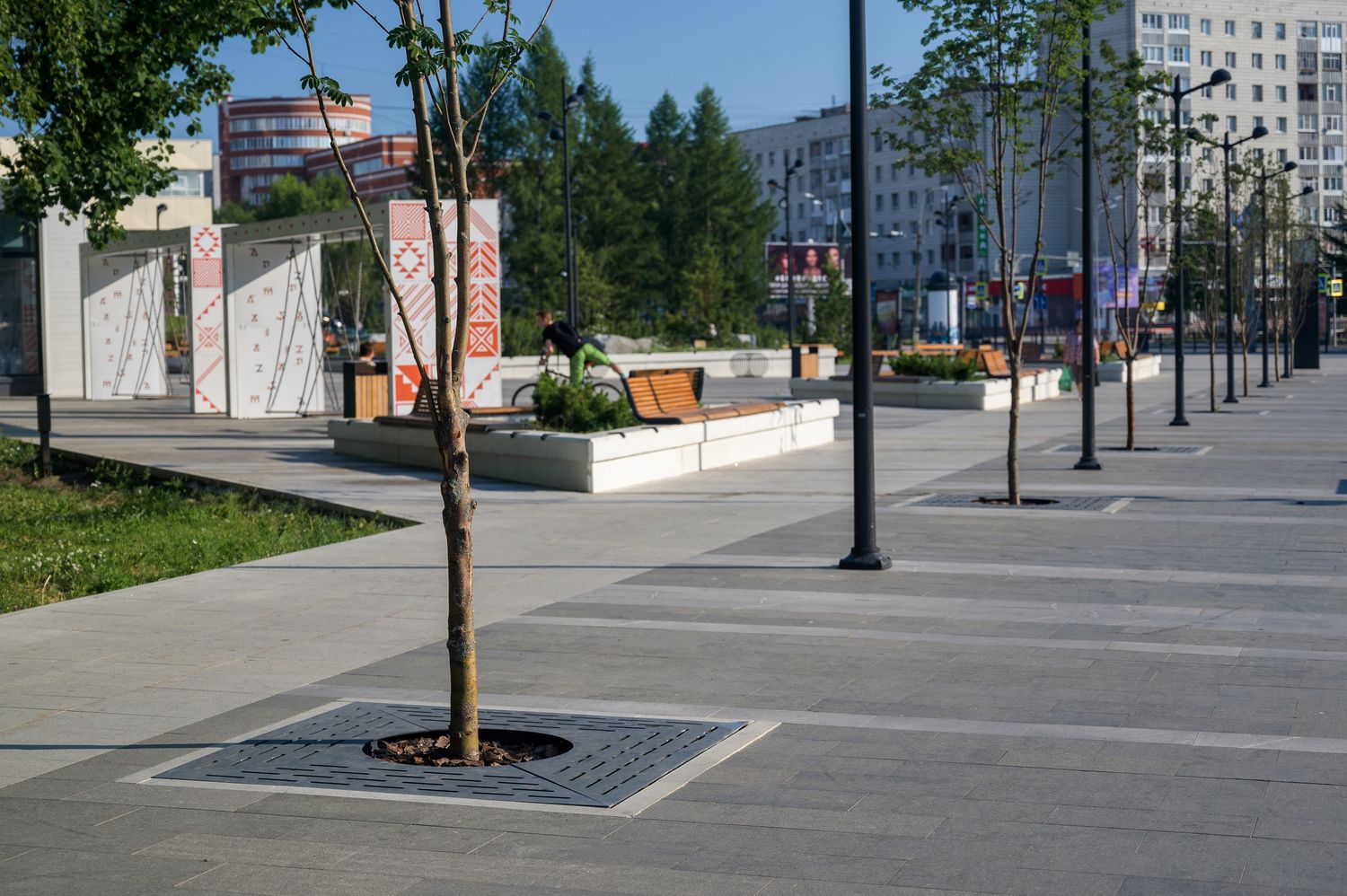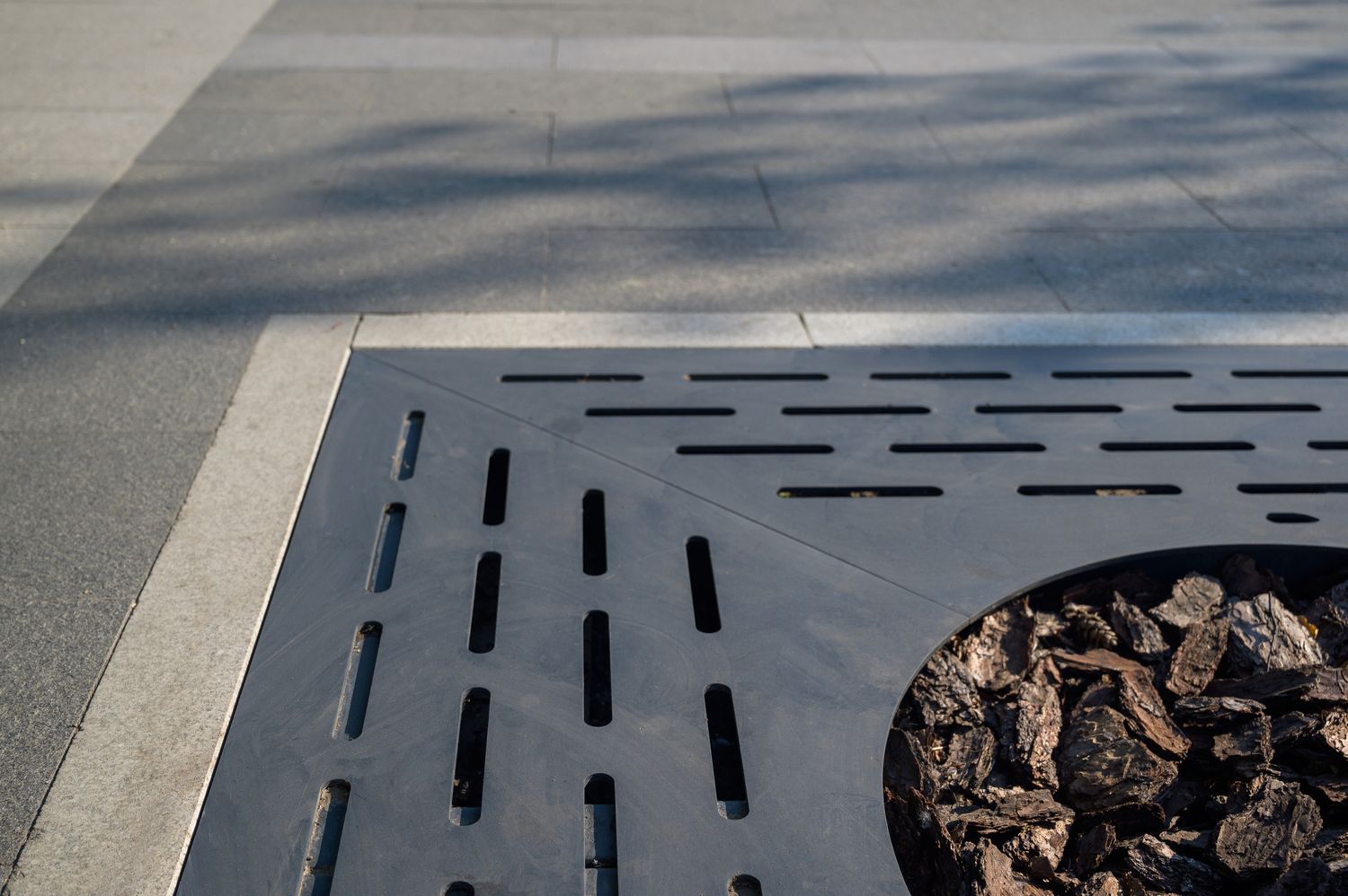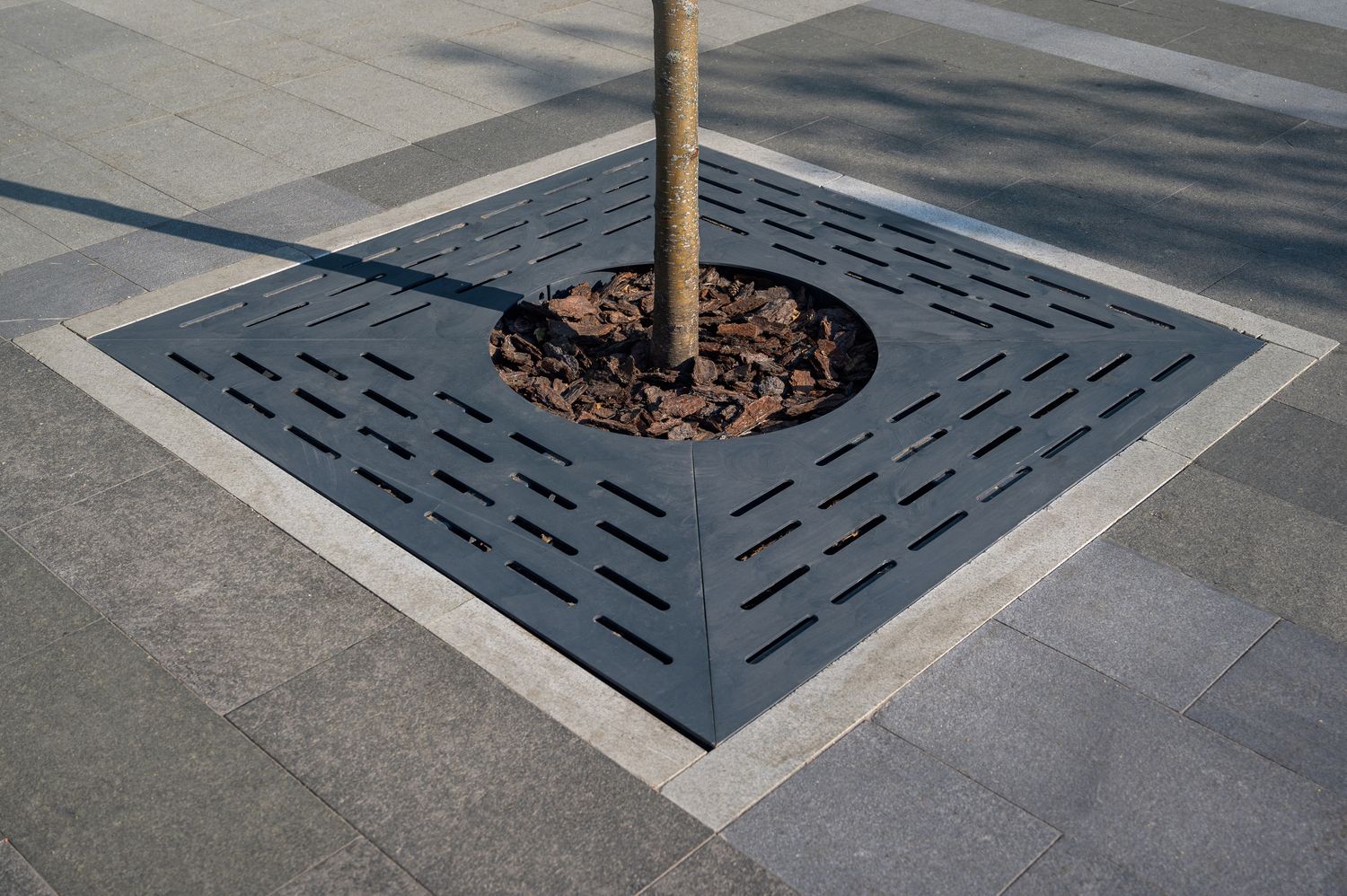 Квадратные формы решетки Cuadrado (от исп. "квадрат") создают современный архитектурный акцент, мягко обрамляя деревья в урбанистическом пространстве. Художественная перфорация стального листа визуально смягчает переход от жесткого мощения к живой природе, создавая деликатный диалог между рукотворным и естественным.