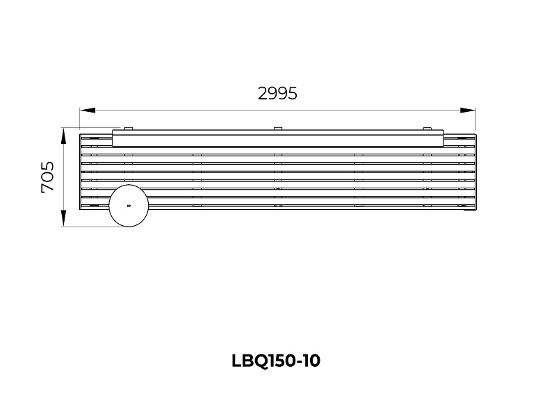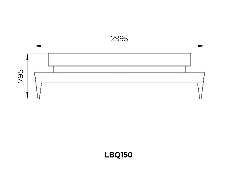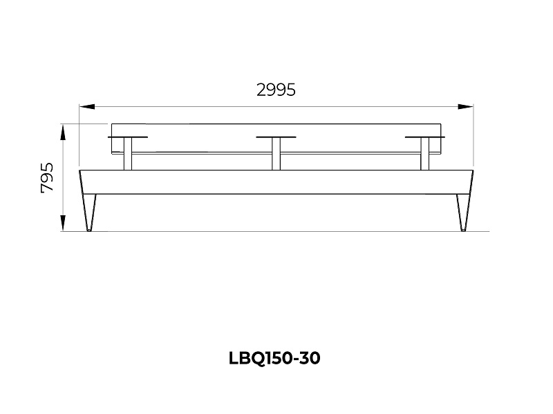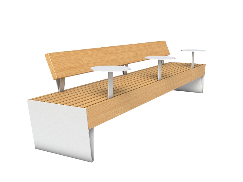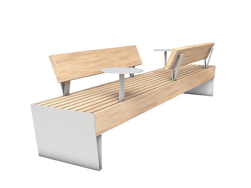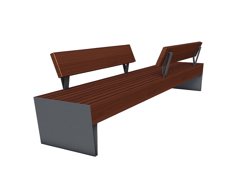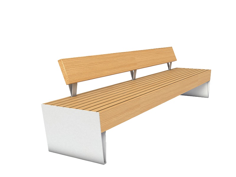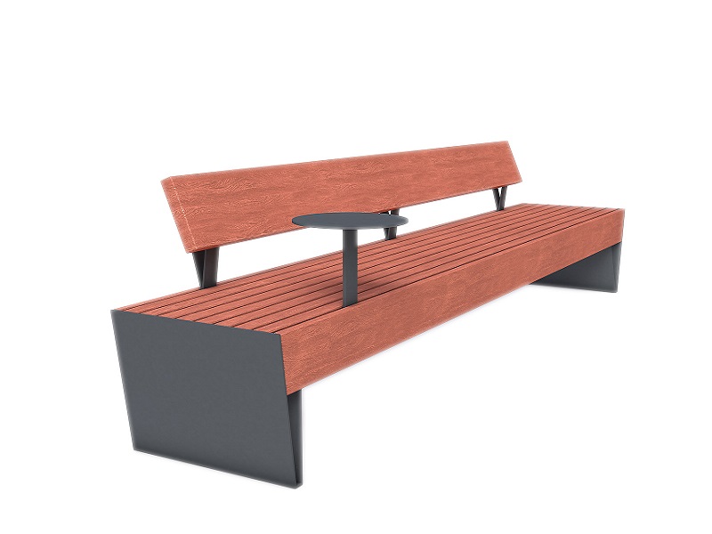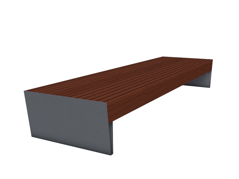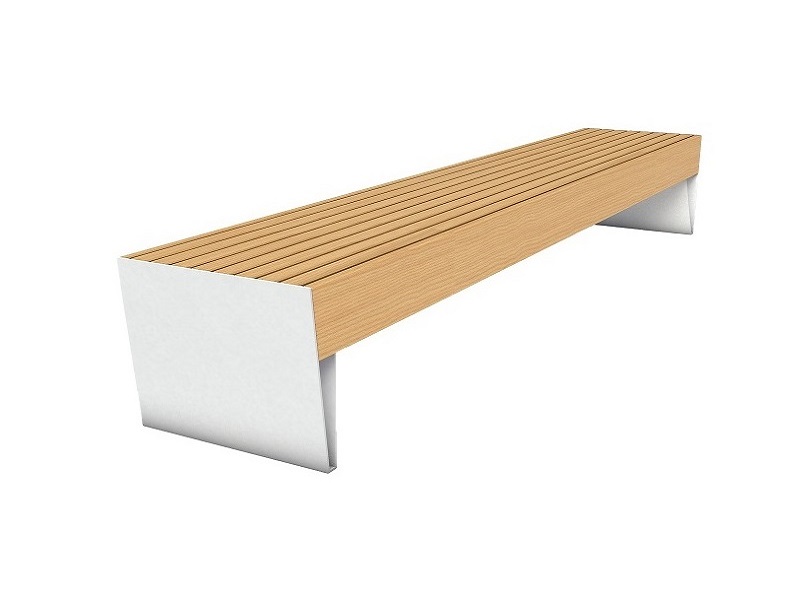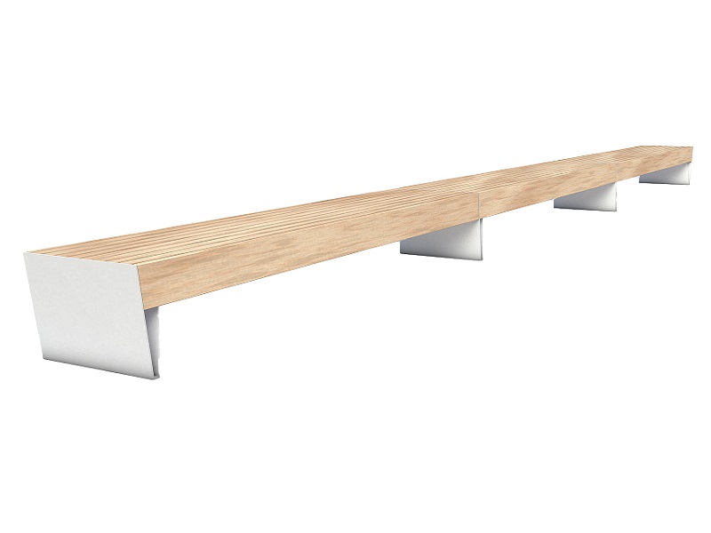 Массивные опорные ножки и элементы конструкции спинки скамьи изготовлены из оцинкованной стали, покрытой порошковой краской. Сиденье и спинка изготовлены из деревянных ламелей и имеют скрытое крепление к несущей конструкции.