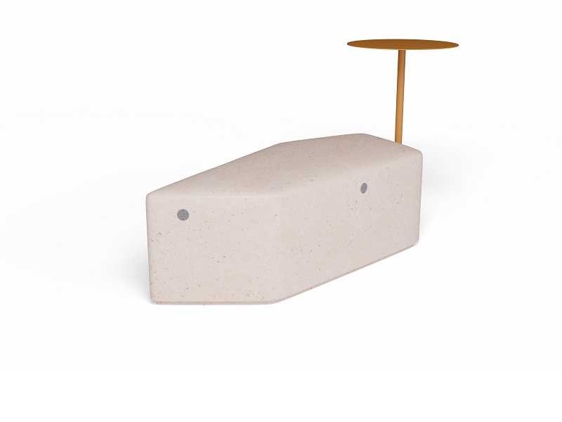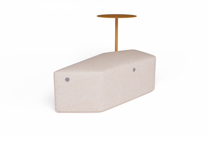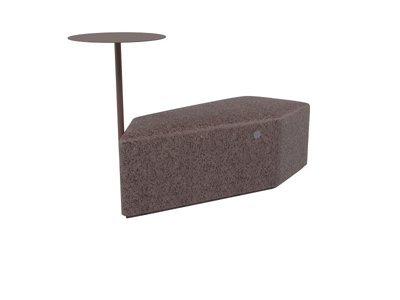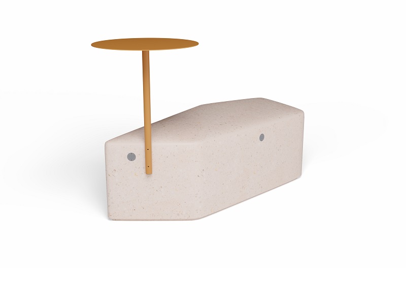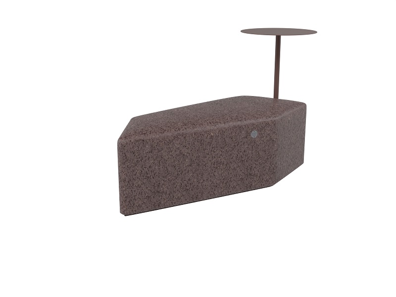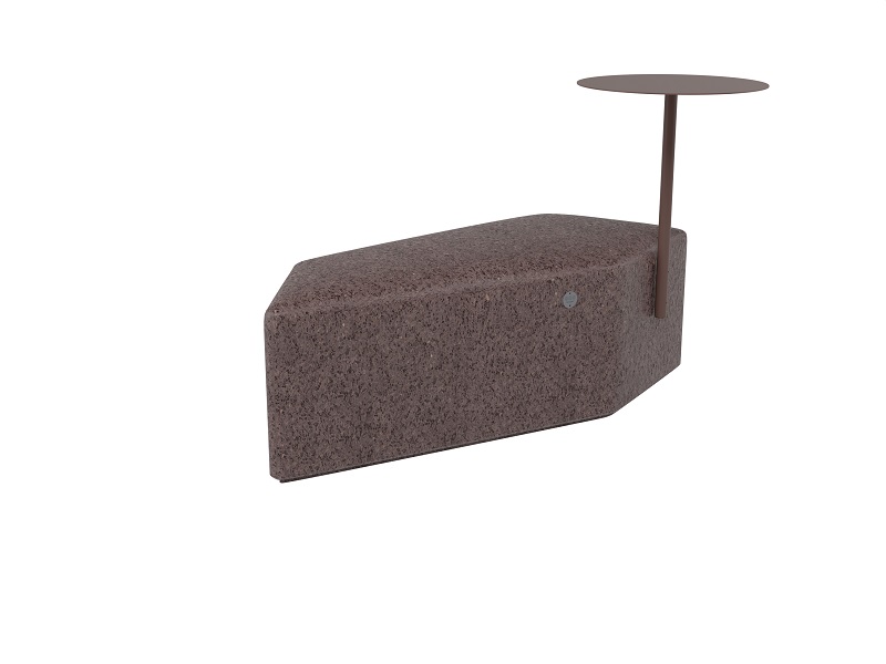 Скамья изготавливается из бетона в любой из стандартных фактур. Снизу у сидения есть небольшой подиум, который визуально отрывает скамью от поверхности земли. Столик изготавливается или из оцинкованной стали и окрашивается порошковой краской или из нержавеющей стали. Крепление столика к модулю производится нержавеющим крепежом.