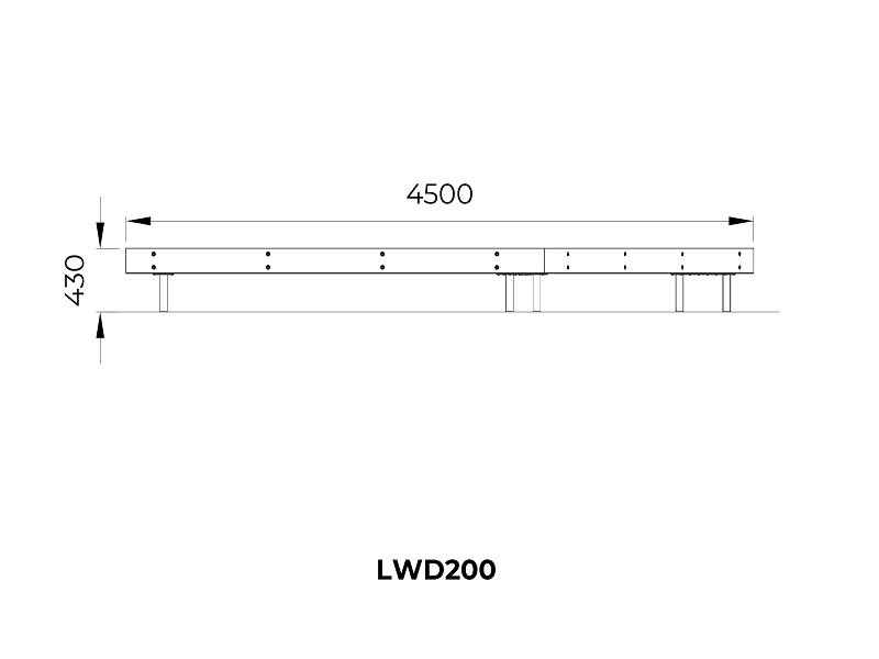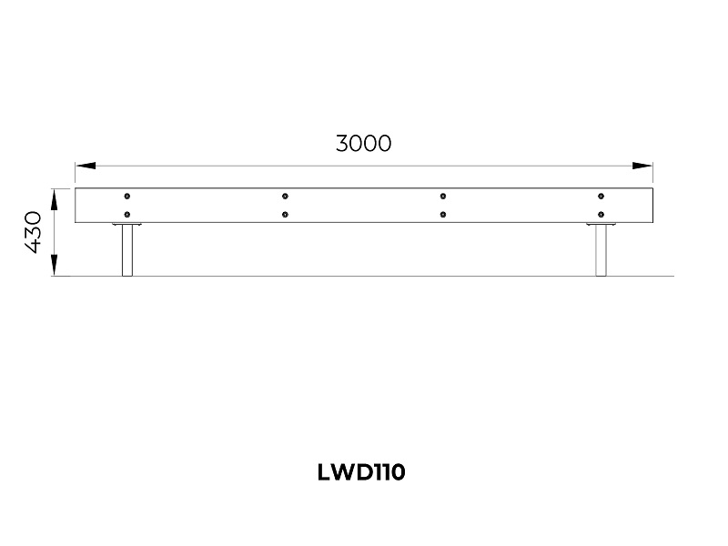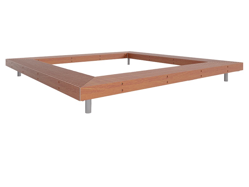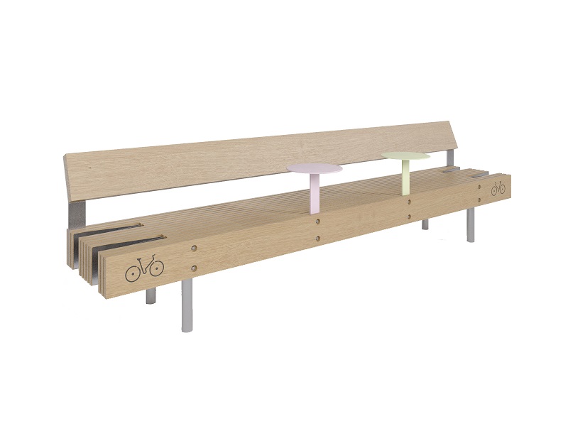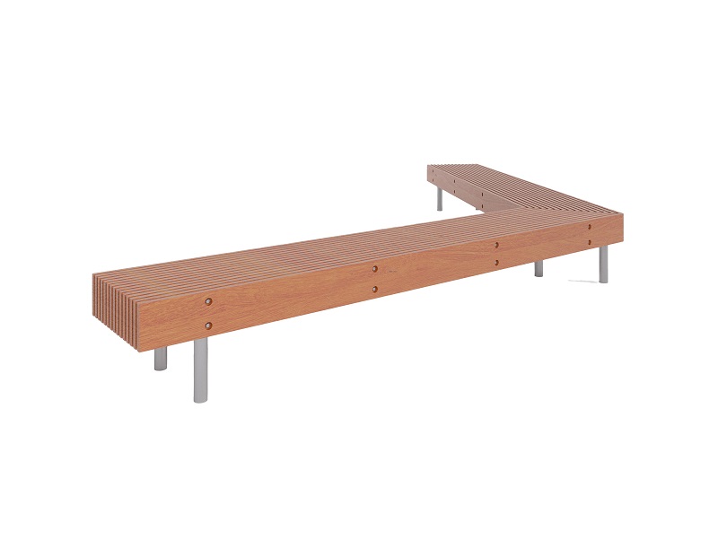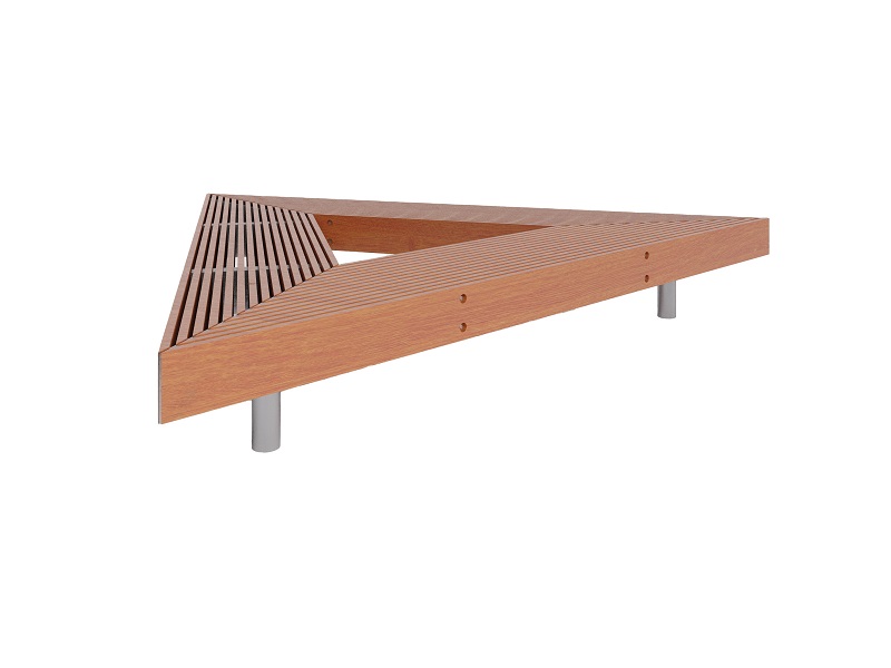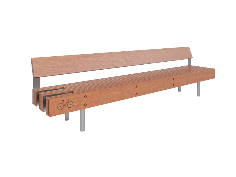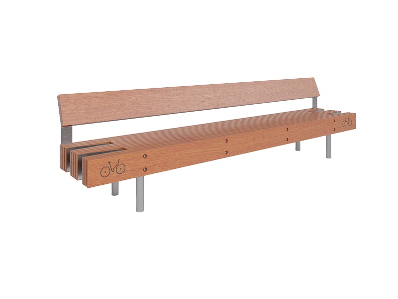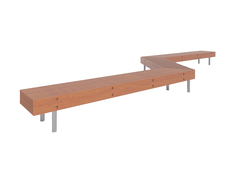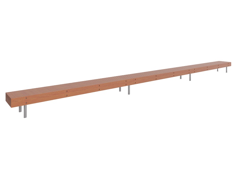 Массивные деревянные доски закреплены винтами из нержавеющей стали в несущий "сэндвич", установленный на стальных оцинкованных ножках, покрытых порошковой краской. Спинка из деревянной доски, которая прикреплена к конструкции при помощи стальных кронштейнов.