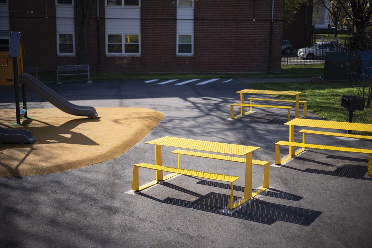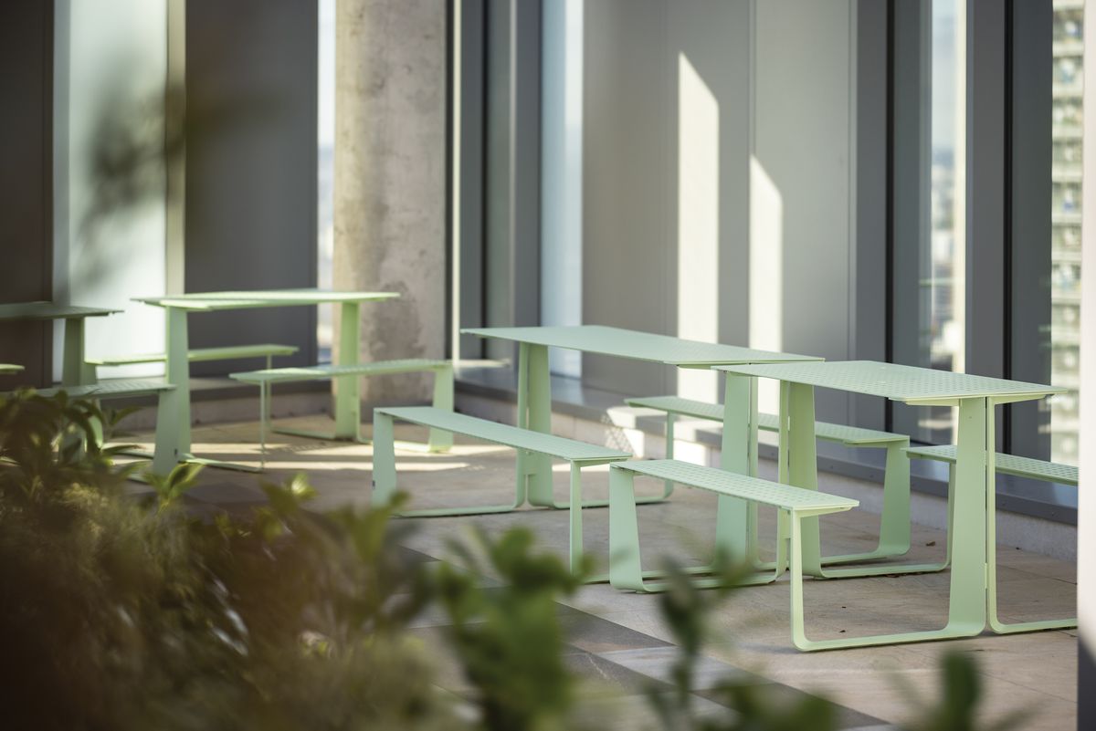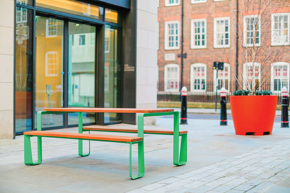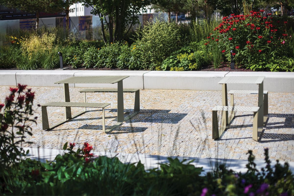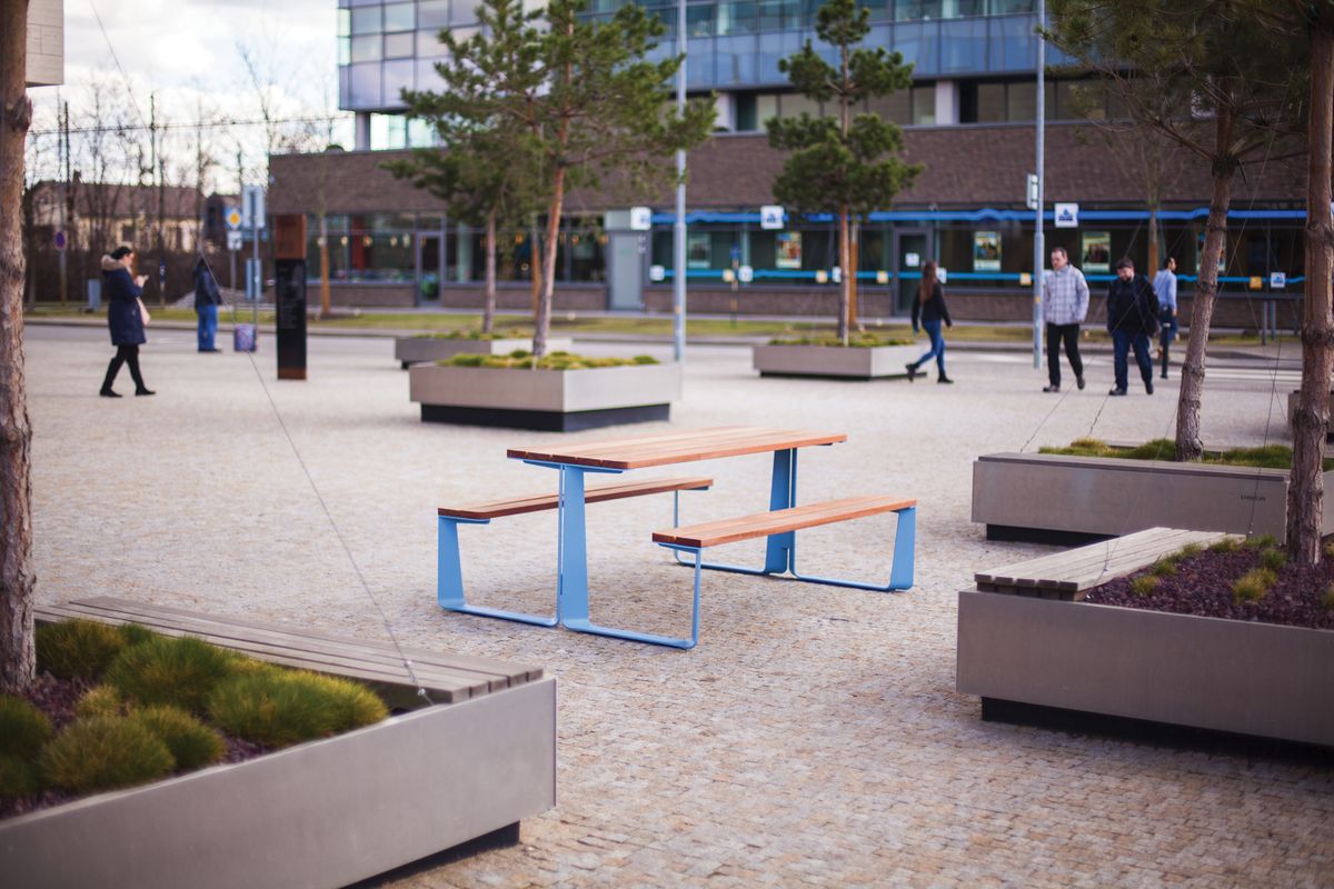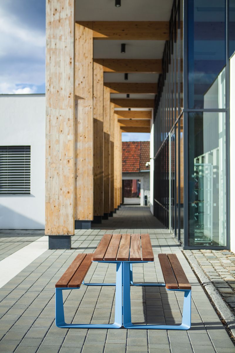 Стальная оцинкованная конструкция, покрытая порошковой краской. Сиденье и стол могут быть изготовлены из деревянных ламелей, стального листа, стальных стержней или HPL-пластика. Возможна любая комбинация этих материалов. Доступен вариант крепления на брусчатку, или без крепления.