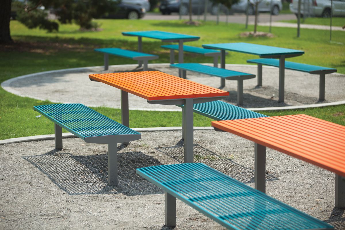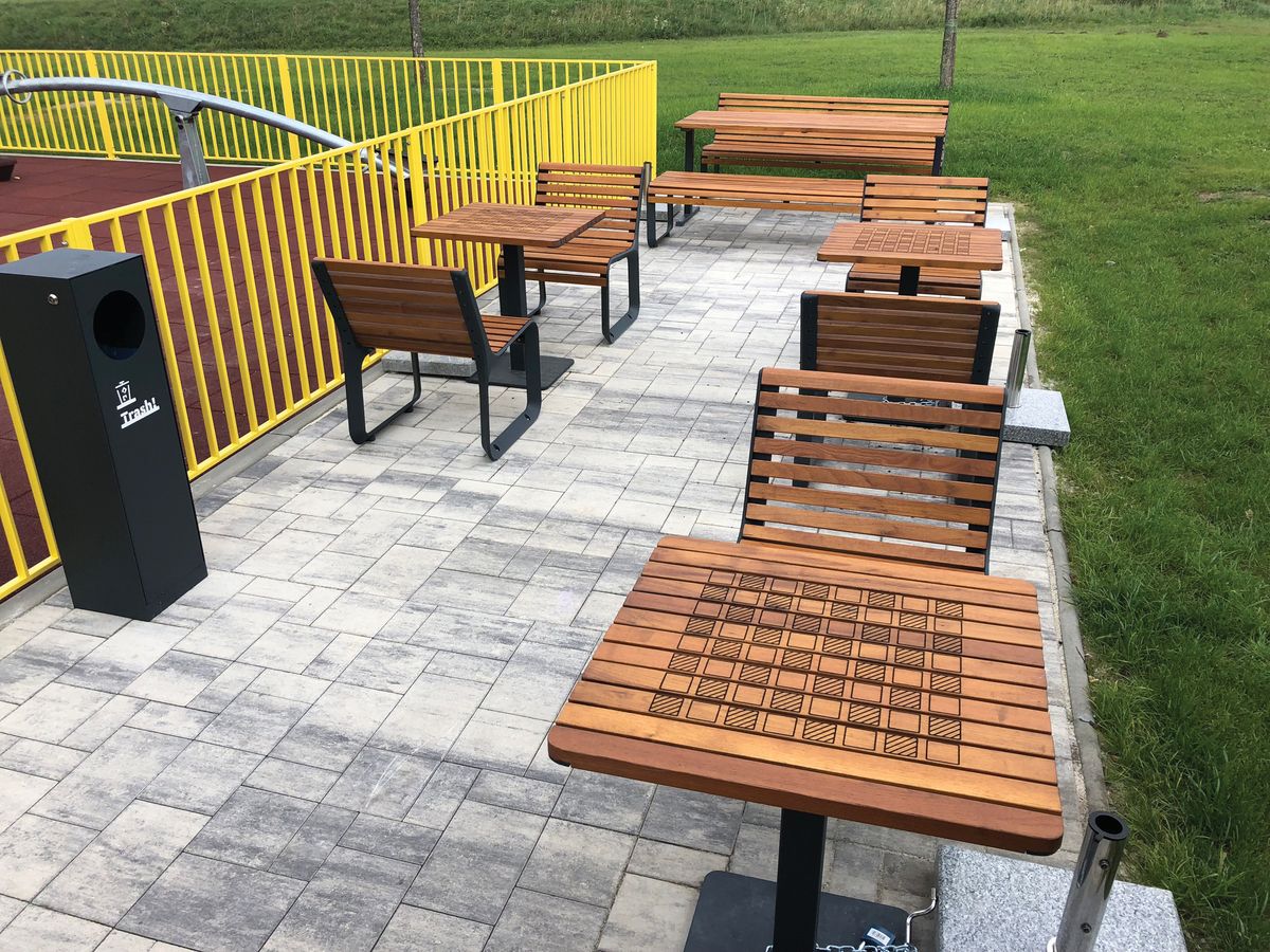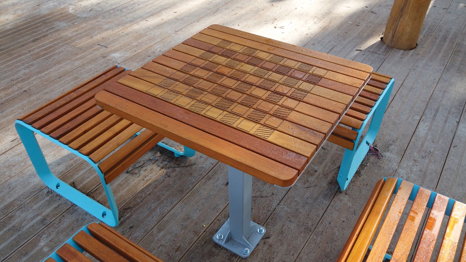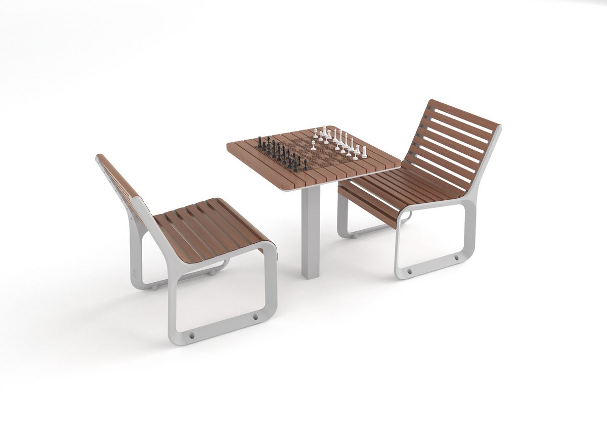 Коллекция комбинирует два вида боковин для столов – с цилиндрической или четырехгранной ножкой, расположенной посередине, также предлагается два вида деревянных ламелей. Серия дополнена вариантом со столешницей из стальных стержней. Это позволяет комбинировать стол с большинством скамеек, предлагаемых в каталоге МАФ маркет. Центральная ножка облегчает доступ к скамье, деревянные ламели или решетка из стальных стержней образуют практичную столешницу. Новинкой являются квадратные столики с шахматной доской, нанесенной лазером на деревянную поверхность стола.