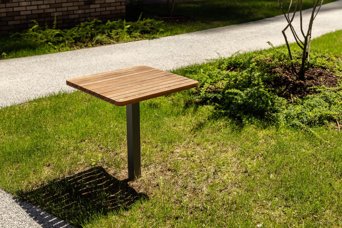 Оцинкованная стальная конструкция, покрытая порошковой краской или без покраски. Столешница из деревянных ламелей или решетки из четырехгранных стальных профилей. Обе ножки прочно закрепляемы под поверхность.