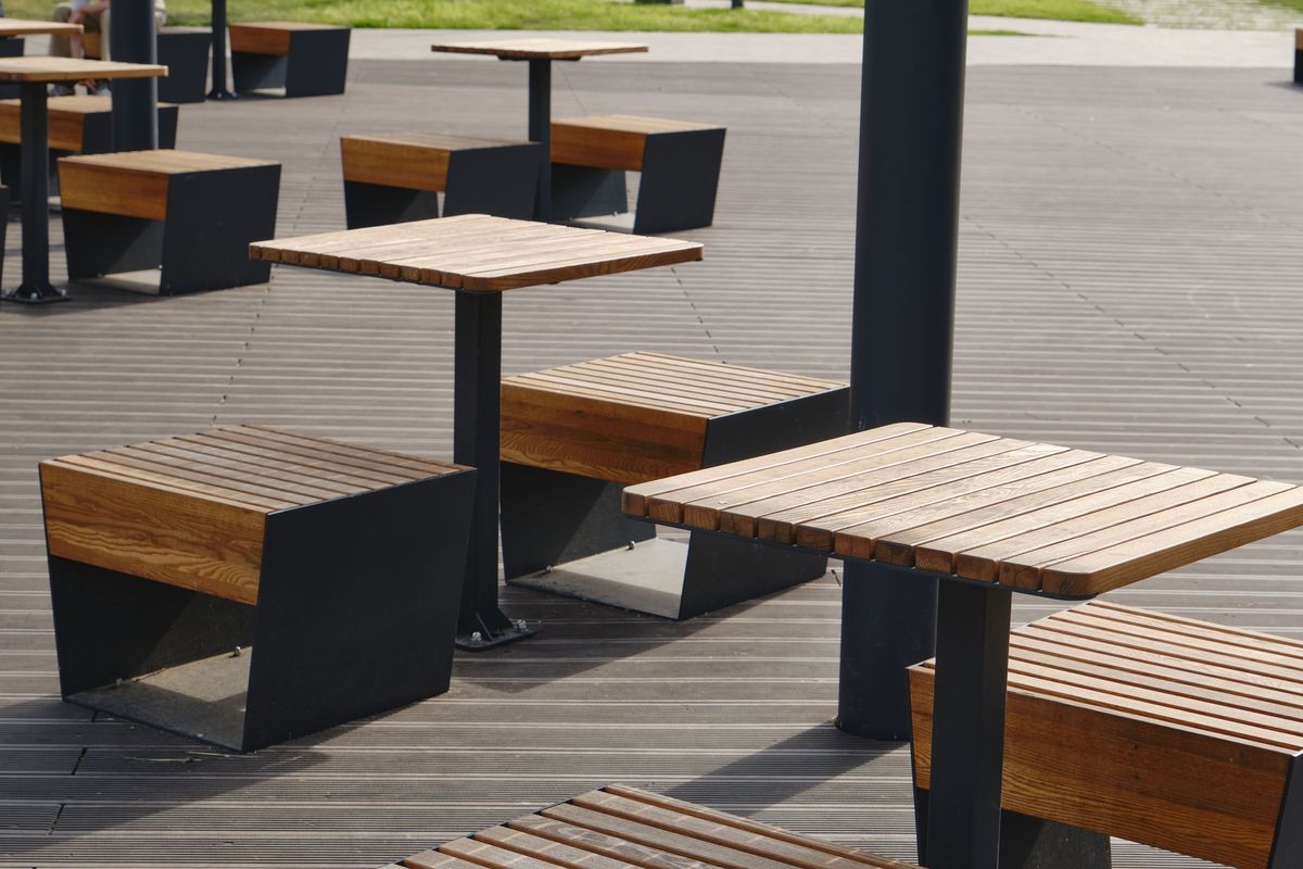 Конструкция из оцинкованной стали, покрытой порошковой краской. Столешница из деревянных досок или же из решетки из стальных стержней, покрытых порошковой краской / стержней из нержавеющей стали.