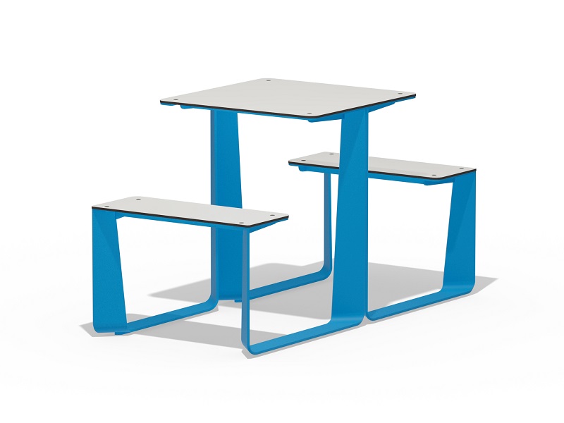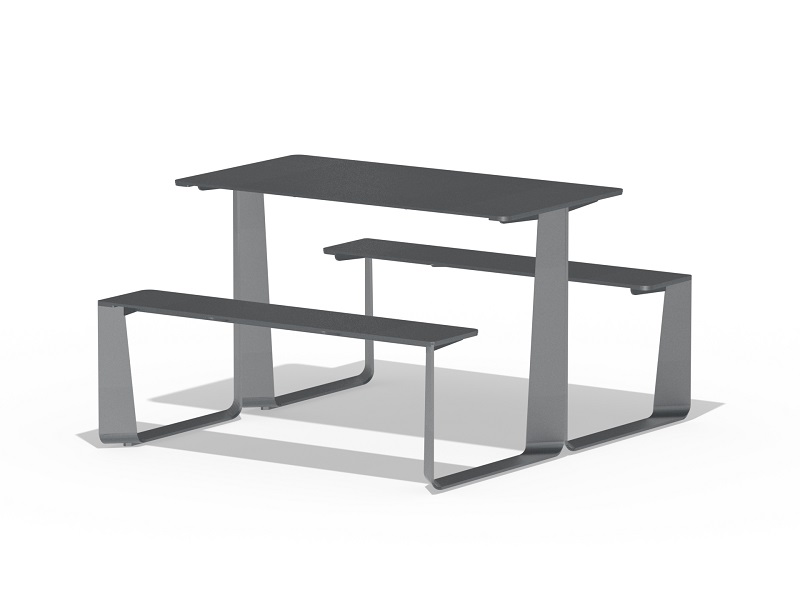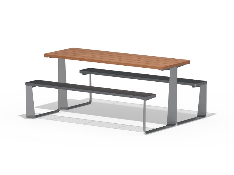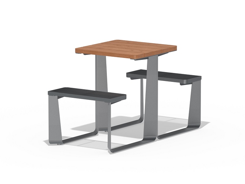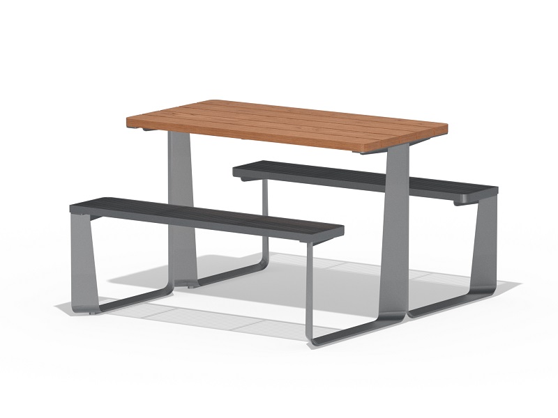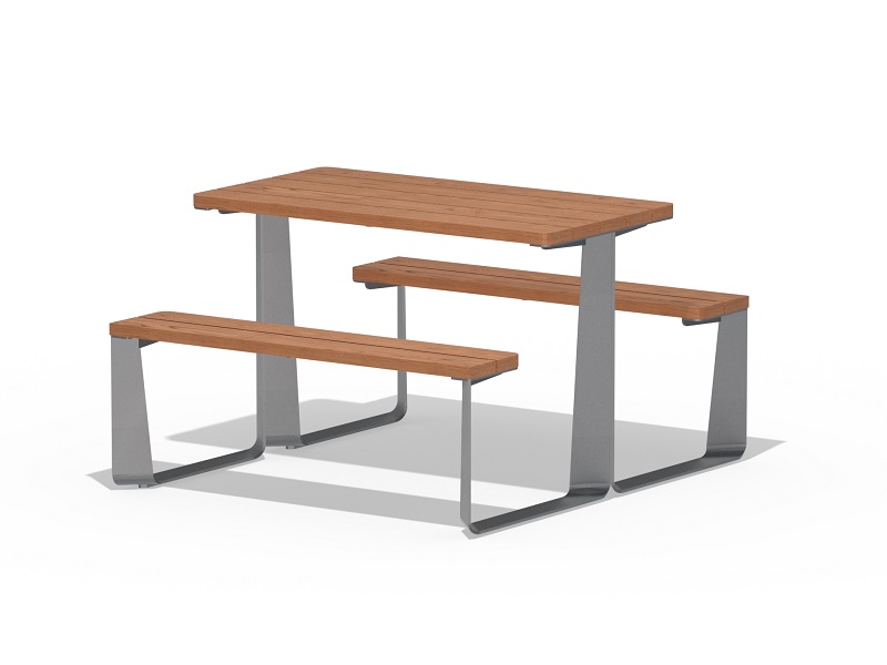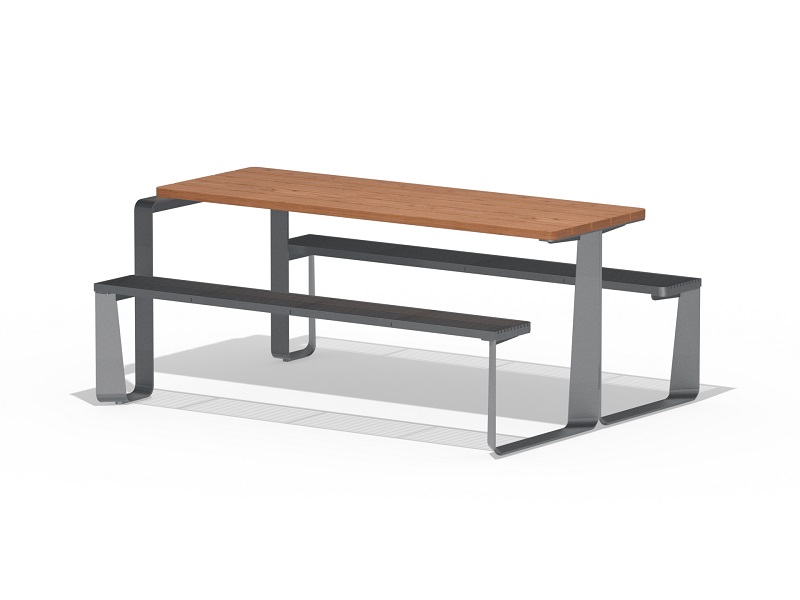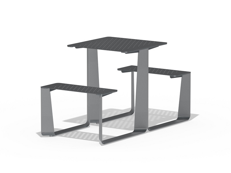 Стальная оцинкованная конструкция, покрытая порошковой краской. Сиденье и стол могут быть изготовлены из деревянных ламелей, стального листа, стальных стержней или HPL-пластика. Возможна любая комбинация этих материалов. Доступен вариант крепления на брусчатку, или без крепления.