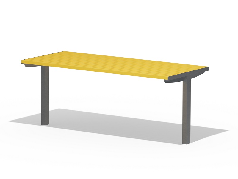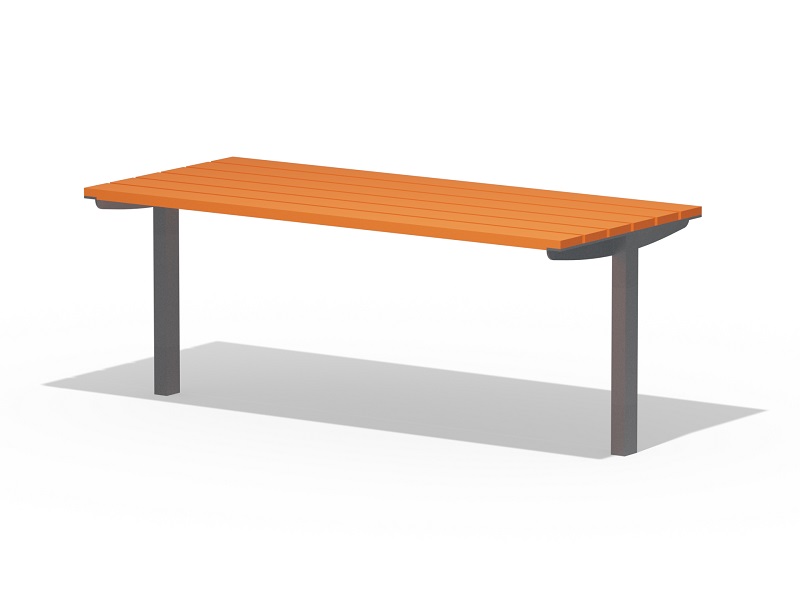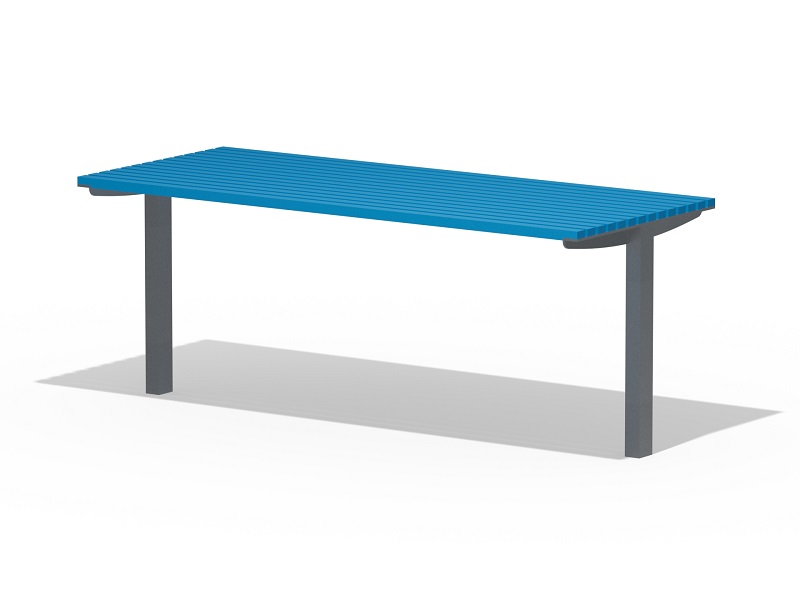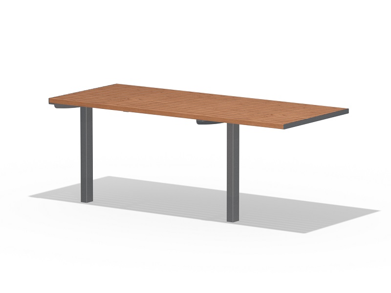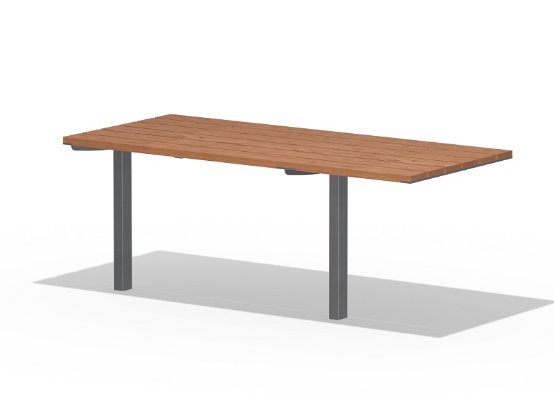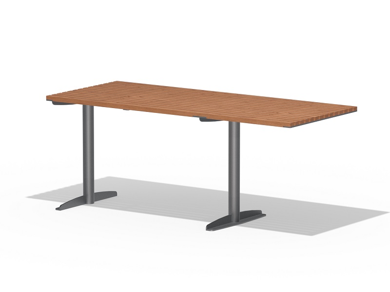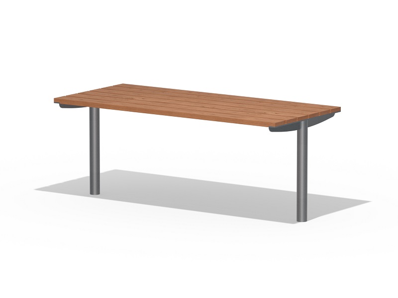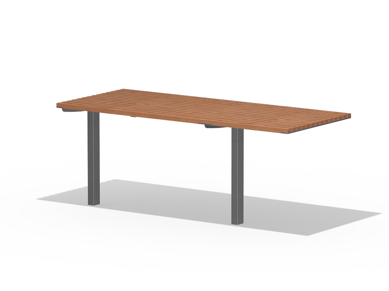 Оцинкованная стальная конструкция, покрытая порошковой краской или без покраски. Столешница из деревянных ламелей или решетки из четырехгранных стальных профилей. Обе ножки прочно закрепляемы под поверхность.