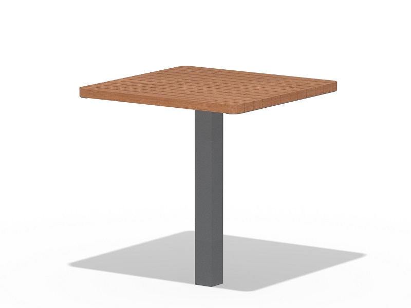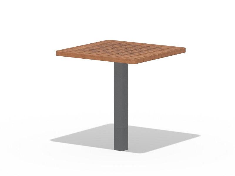 Коллекция комбинирует два вида боковин для столов – с цилиндрической или четырехгранной ножкой, расположенной посередине, также предлагается два вида деревянных ламелей. Серия дополнена вариантом со столешницей из стальных стержней. Это позволяет комбинировать стол с большинством скамеек, предлагаемых в каталоге МАФ маркет. Центральная ножка облегчает доступ к скамье, деревянные ламели или решетка из стальных стержней образуют практичную столешницу. Новинкой являются квадратные столики с шахматной доской, нанесенной лазером на деревянную поверхность стола.