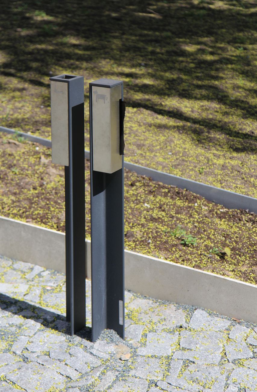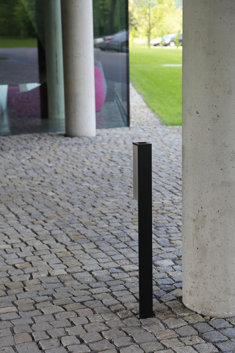 L-образный профиль из горячеоцинкованной стали, покрытый порошковой краской, является основой для емкости пепельницы, которая может запираться на ключ из нержавеющей стали или диспенсер для пакетов. Монтаж на мощение или ниже уровня мощения на предварительно подготовленное бетонное основание.