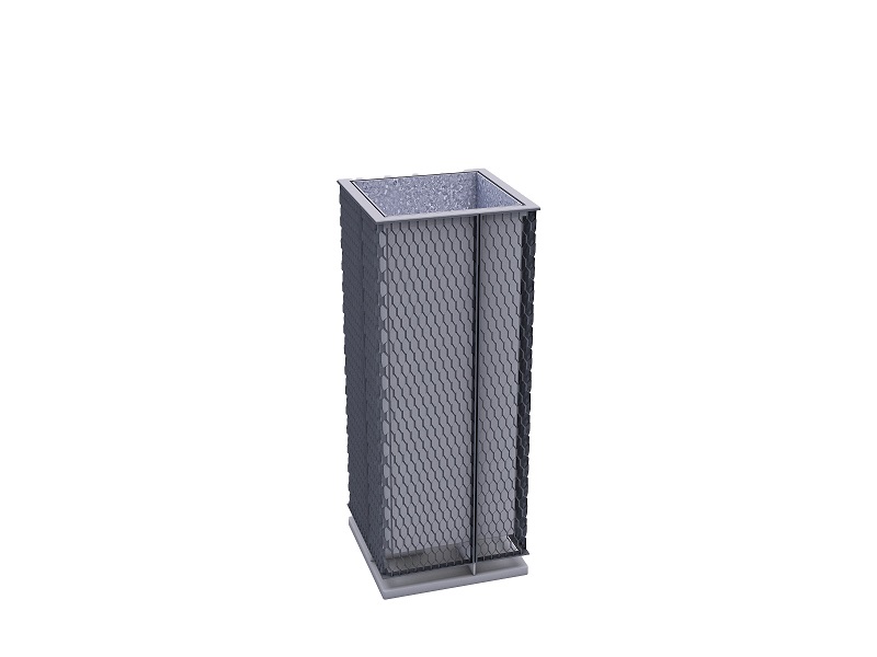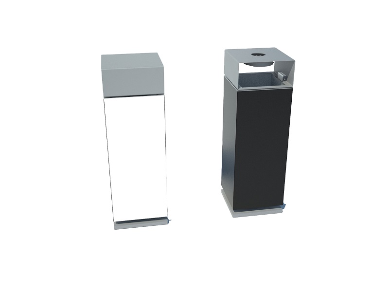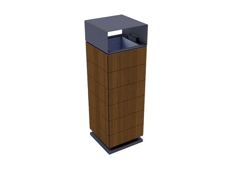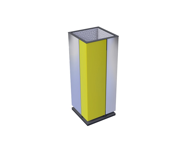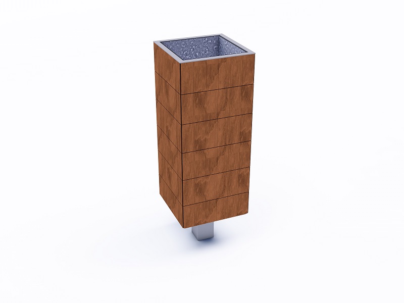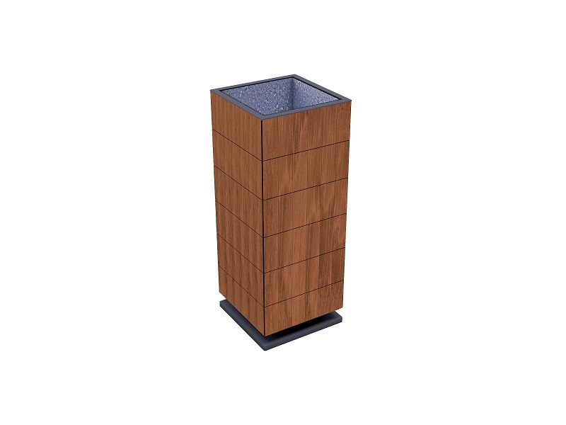 Каркас из горячеоцинкованной стали, покрытой порошковым покрытием. Обшивка выполнена из деревянных планок, армированного гнутого металлического листа, ПВЛ или HPL. Дополнительная крышка изготовлена из алюминия или нержавеющей стали, покрытой порошковым покрытием. Крышка может дополнительно комплектоваться пепельницей из нержавеющей стали. Внутренняя вставка из оцинкованного стального листа. Монтируется на поверхности или закрепляется ниже уровня мощения на предварительно подготовленное бетонное основание.