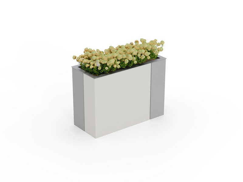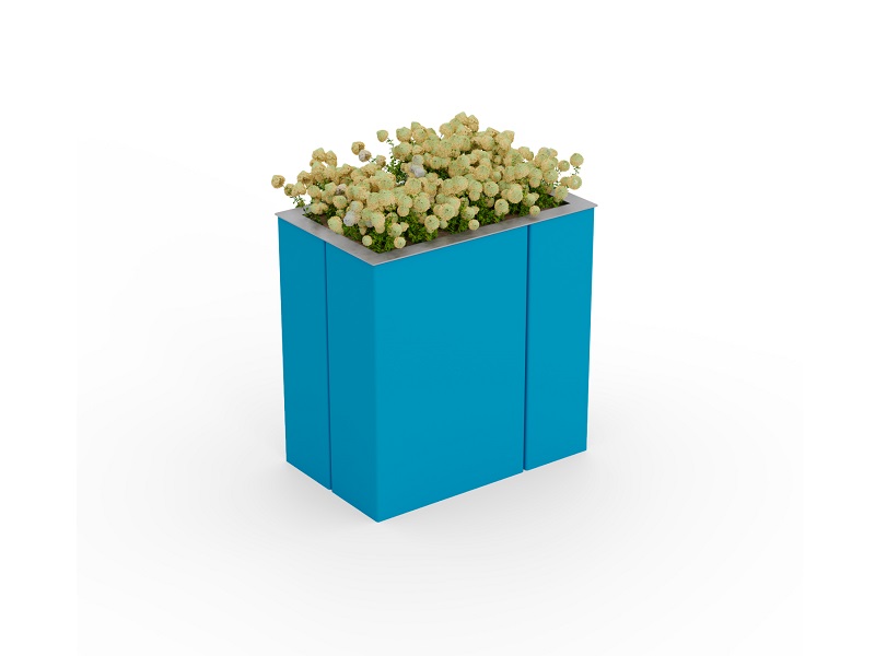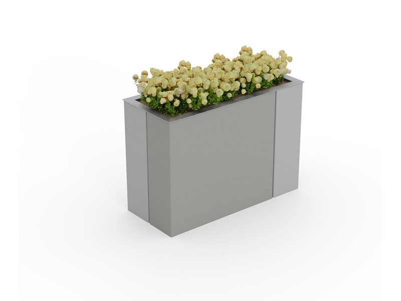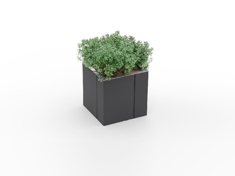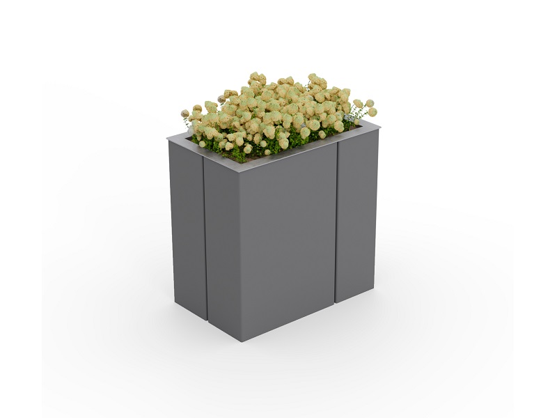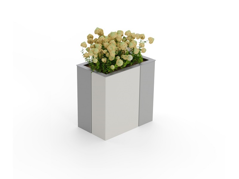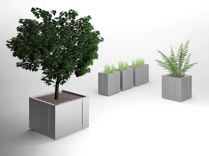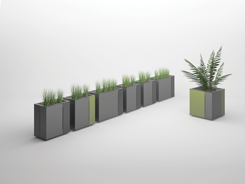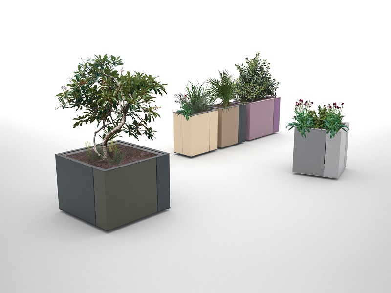 Вазоны с системой автоматического полива. Панели из алюминиевого листа, согнутые углом, разделены асимметрично, что придает продукту неповторимый характер. Благодаря простой форме вазон можно разместить практически везде: будь то большие площади, где лучше всего смотрится монументальная квадратная модель, или пространства у торговых центров для более изящного прямоугольного варианта.