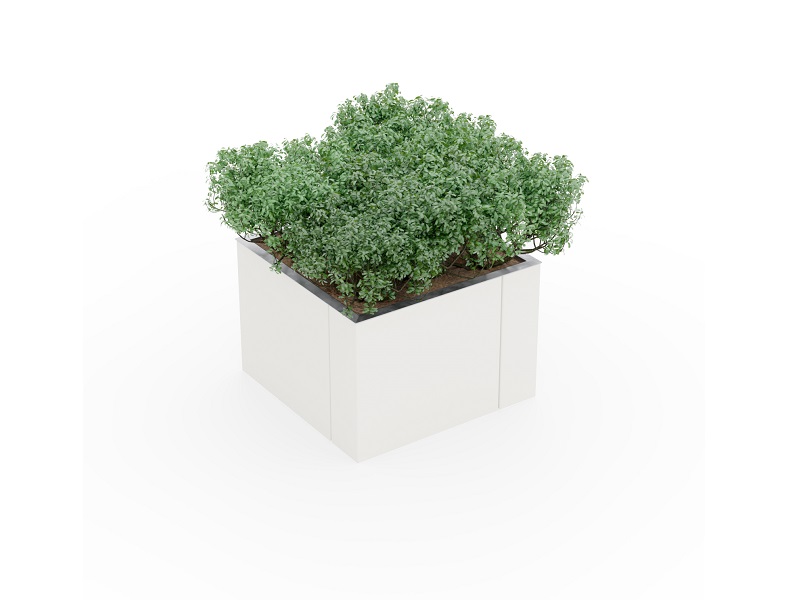 Несущий каркас из оцинкованной стали с облицовкой из изогнутых алюминиевых листов, покрытых порошковой краской. Внутренний контейнер из оцинкованного листового металла с системой полива. Устанавливается на ножки, по запросу можно добавить колесики для удобного перемещения.