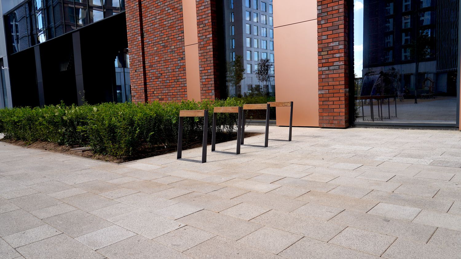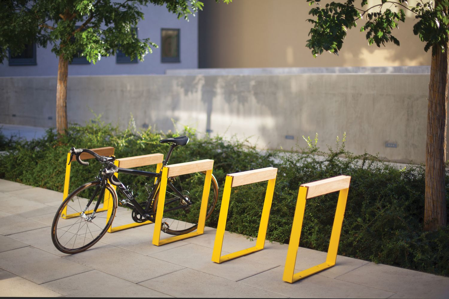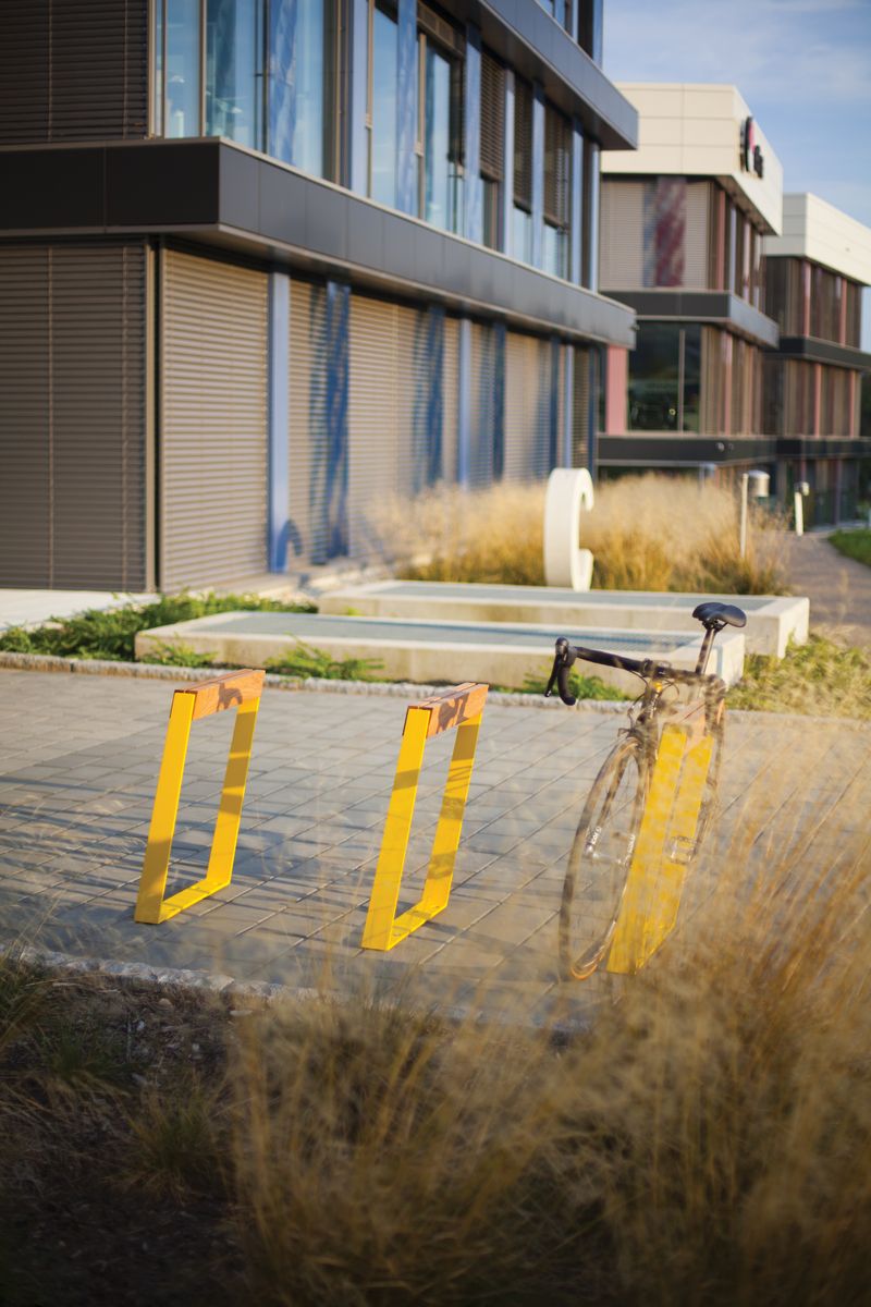 Простая рама, отделанная горизонтальным деревянным элементом, идеально поддерживает велосипед, который можно припарковать с обеих сторон. Подставка для велосипеда наклонена под тем же углом, что и ножки скамей серии Blocq, поэтому она идеально вписывается в остальную линейку. Она отлично подходит как для самостоятельной установки, так и для использования рядом с другими предметами уличной мебели, всегда отлично смотрится и великолепно выполняет свою функцию.