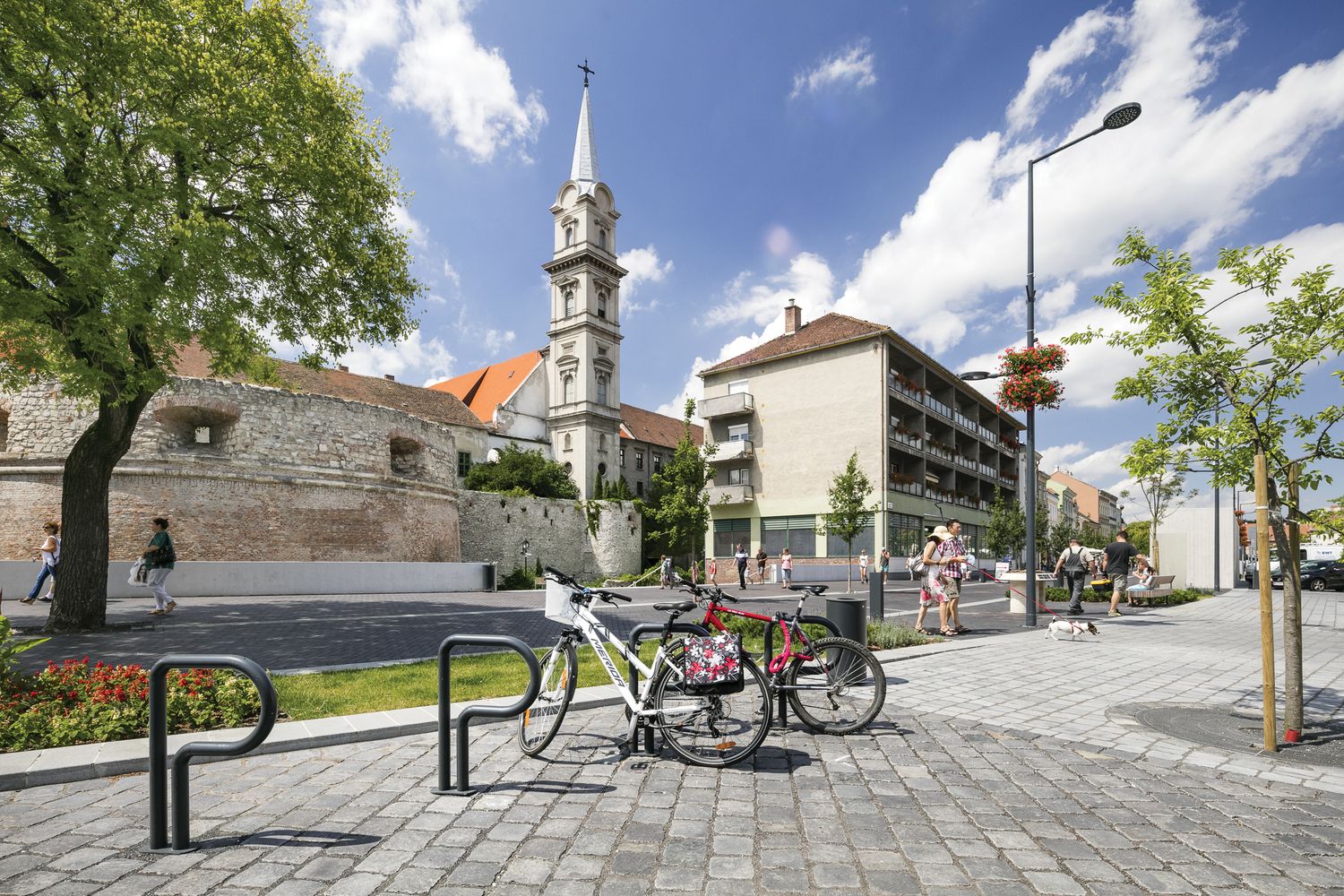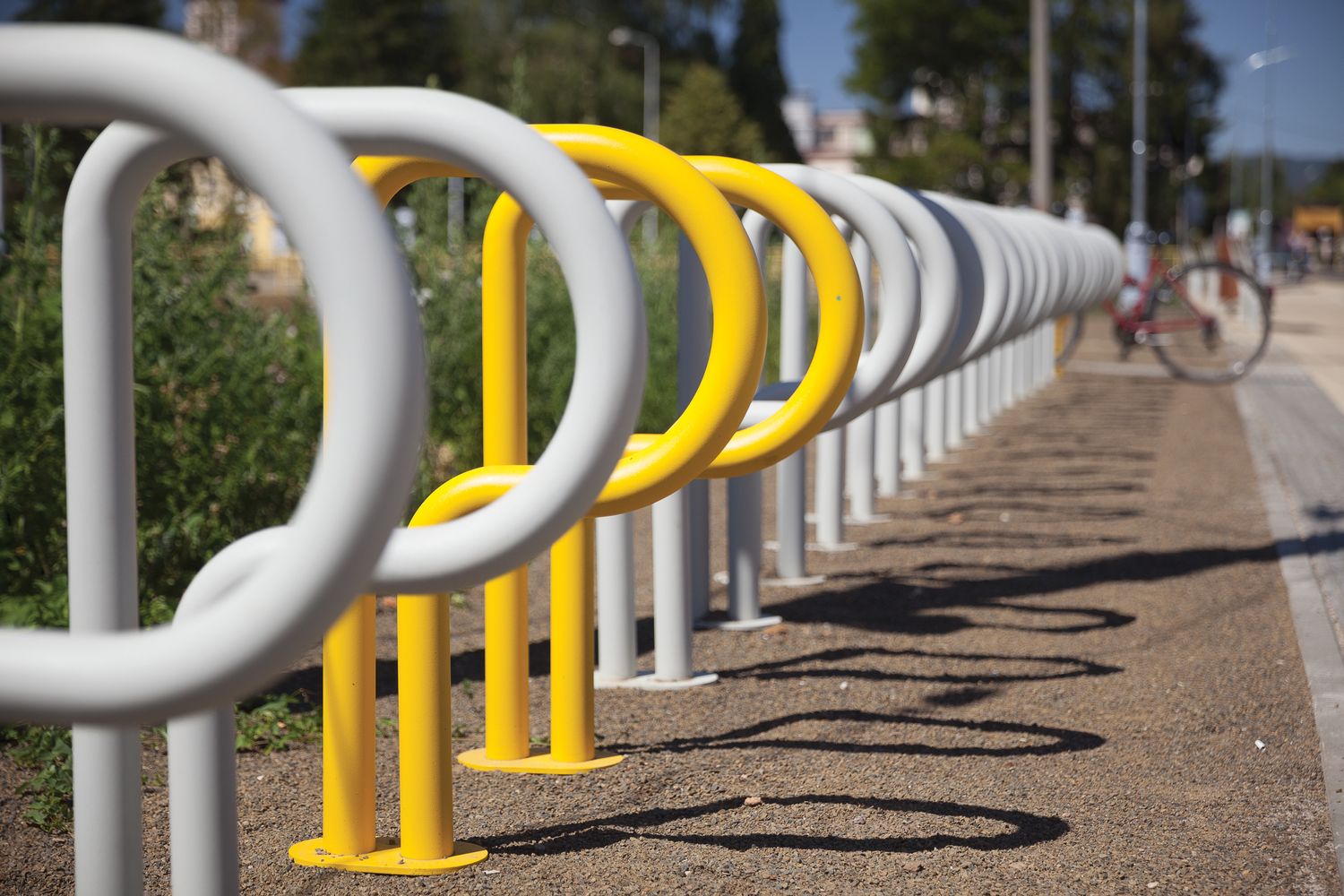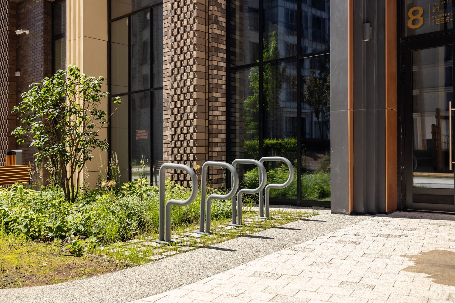 Опора для велосипедов, в которой четко обозначена буква P, форма которой с юмором используется для чисто функционального решения. Это часть общей системы, изначально установленной на парковочных местах на улицах. Он отлично смотрится как отдельно стоящий элемент, так и в составе групп.