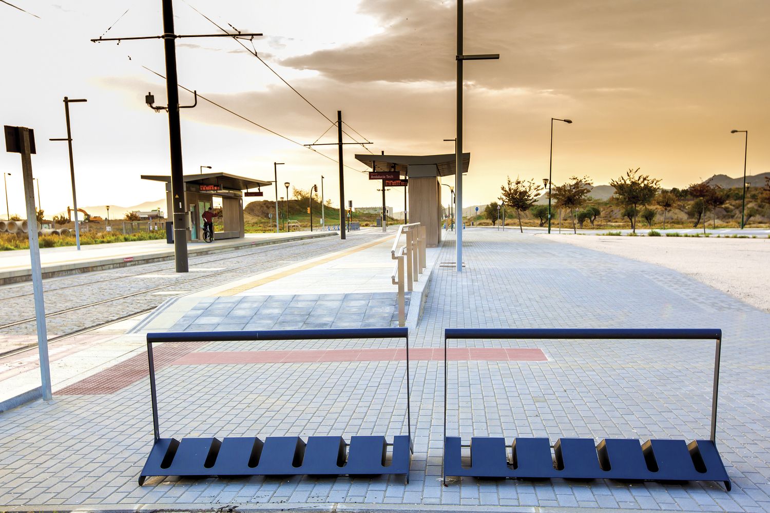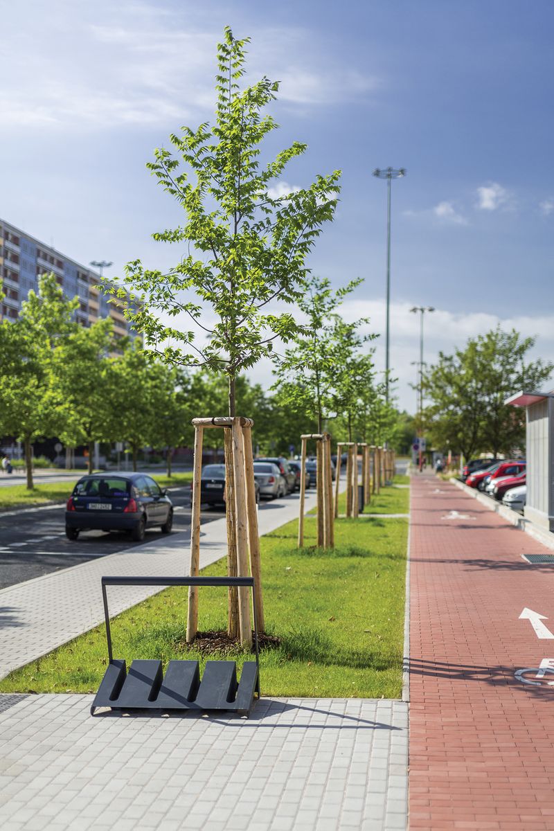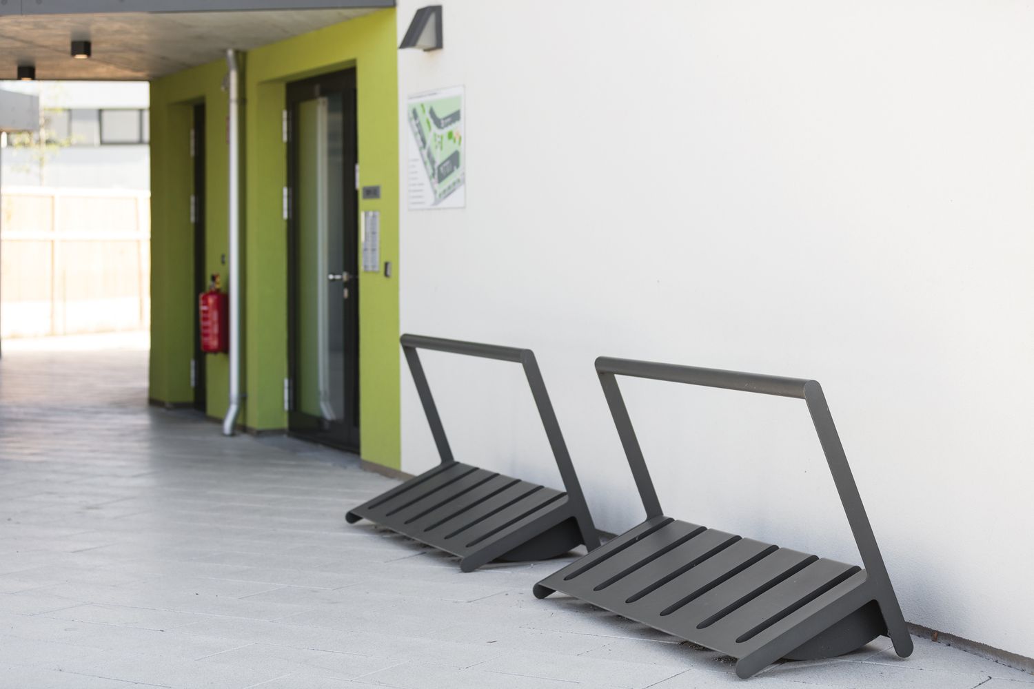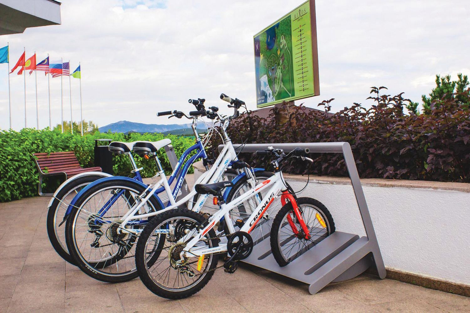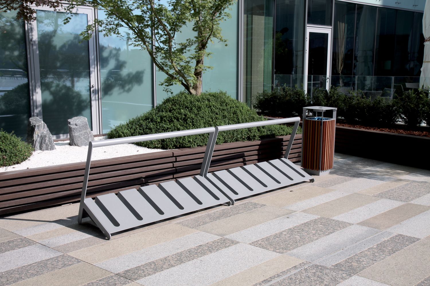 Конструкция из горячеоцинкованной стали, покрытая порошковой краской. Доступны в двух размерах для четырех или шести велосипедов. С горизонтальной рейкой для фиксации велосипедов. Для крепления на поверхность мощения с помощью анкеров.